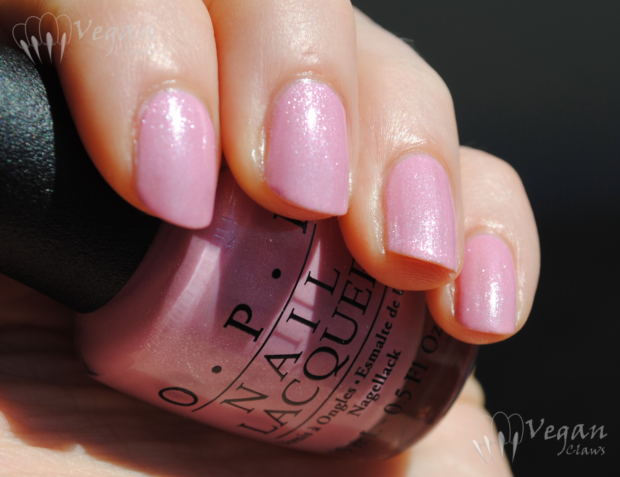 This one is OPI Pedal Faster Suzi from the spring Holland collection. Silly name (why does Suzi need to name so many polishes after herself?!), pretty colour. It’s a light-medium pink, not too bright but not dusty either, with silver shimmer flecks that sparkle blue and pink in the light, which you can see if you enlarge the third photo. Shown are two coats. It has a nice formula with no application problems.