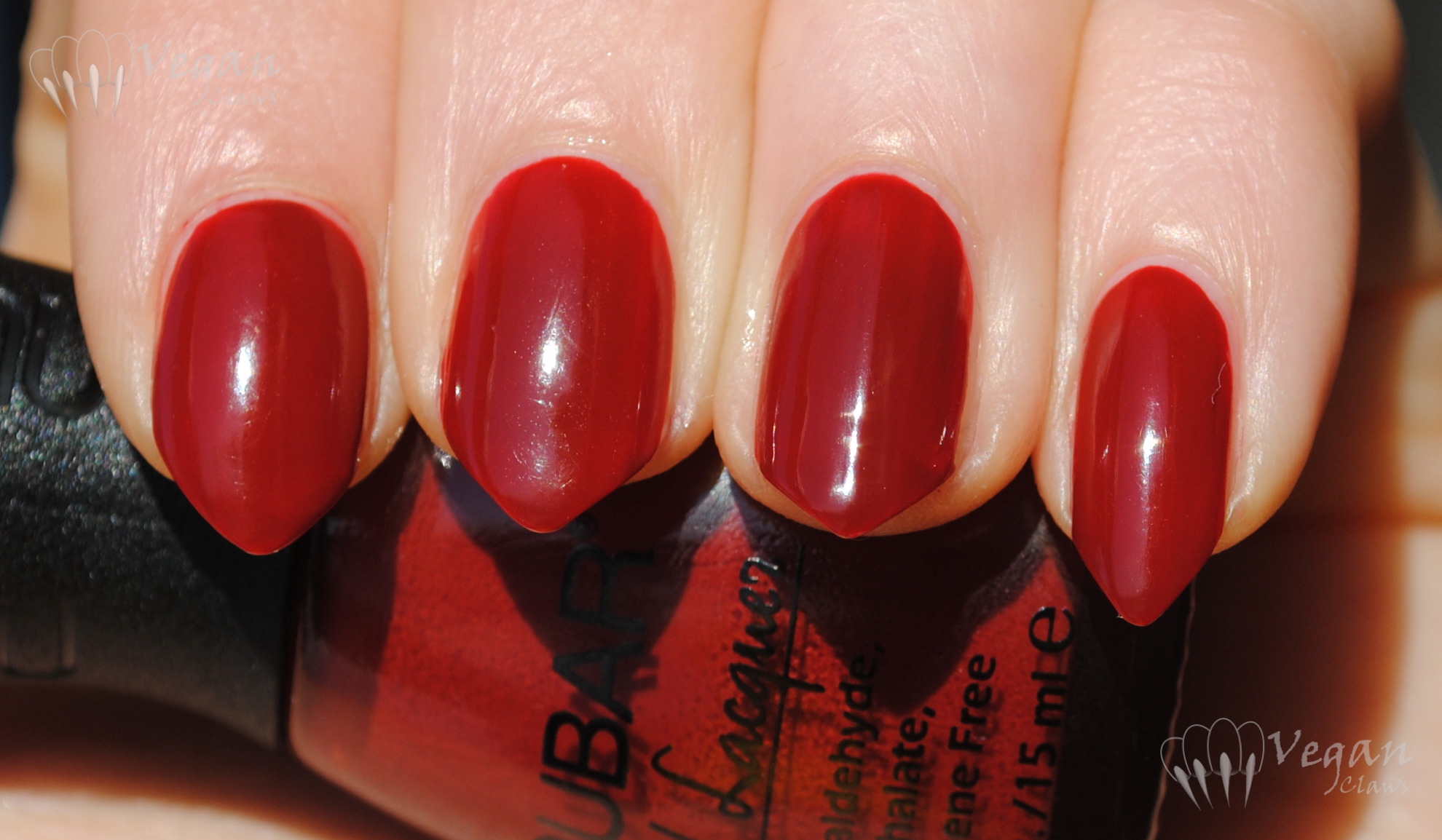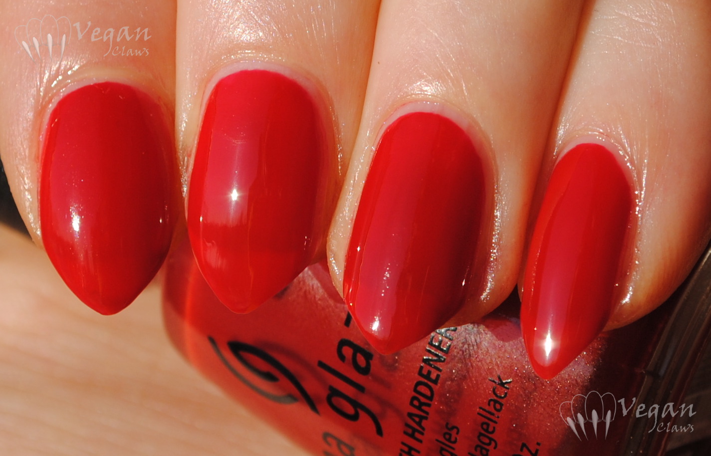 But it is a nice jellyish candy-apple red that leans warm. Shown are three coats; no application issues with this polish.