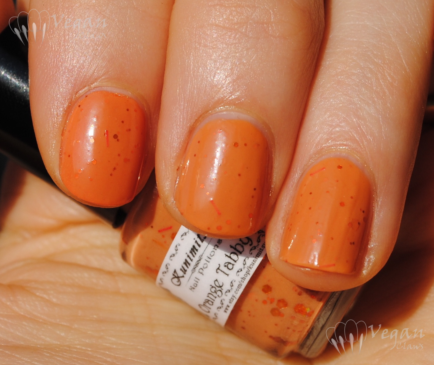 This is Orange Tabby, a light orange creme with small orange bar glitter and several sizes of orange hex glitter.