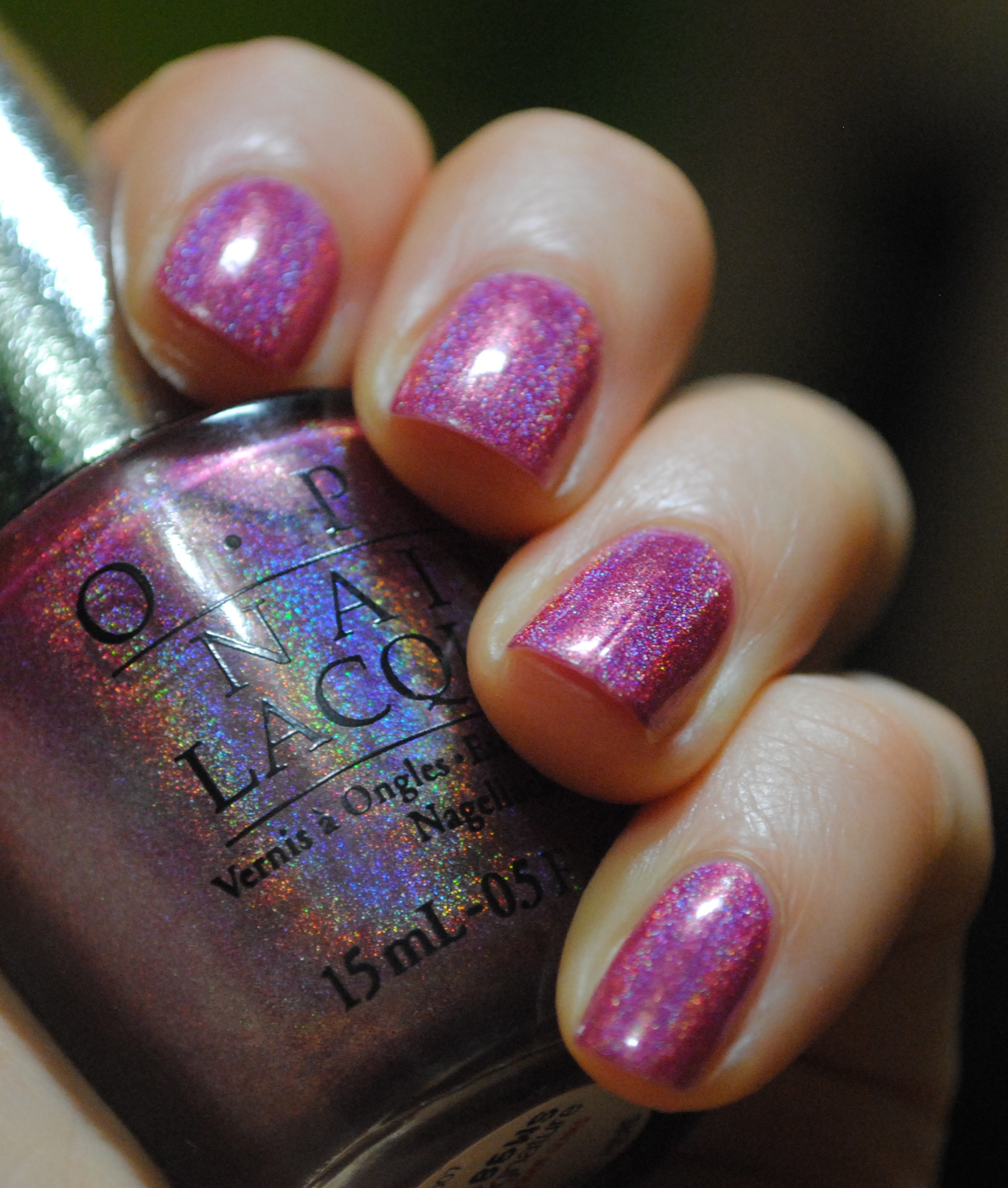 Here’s another discontinued, hard-to-find OPI polish that I happened to take pictures of recently: DS Signature, a great medium pink holo. Two coats.