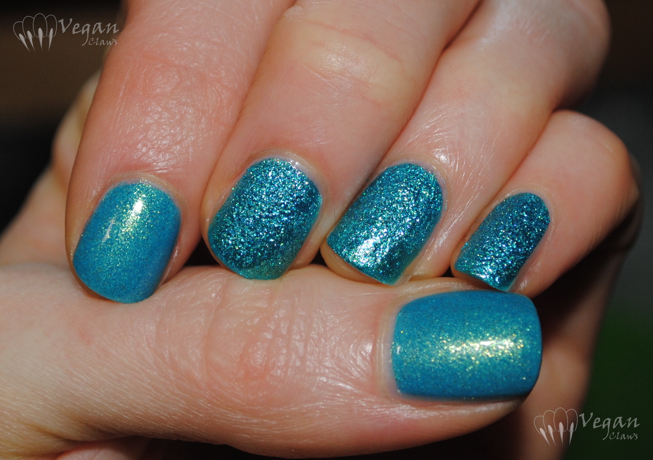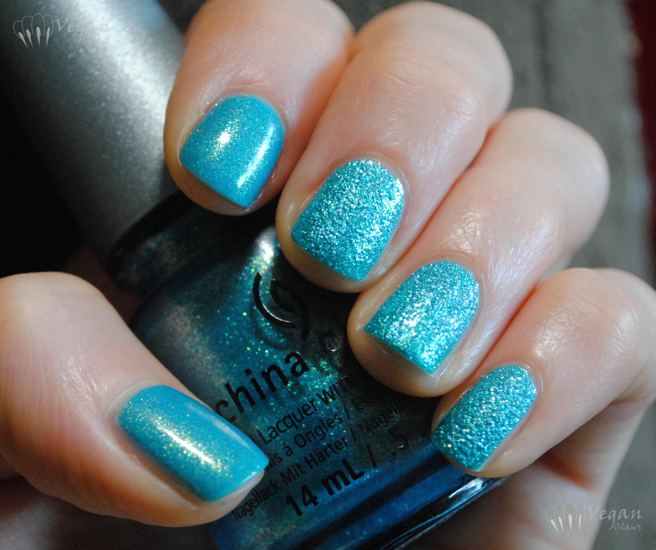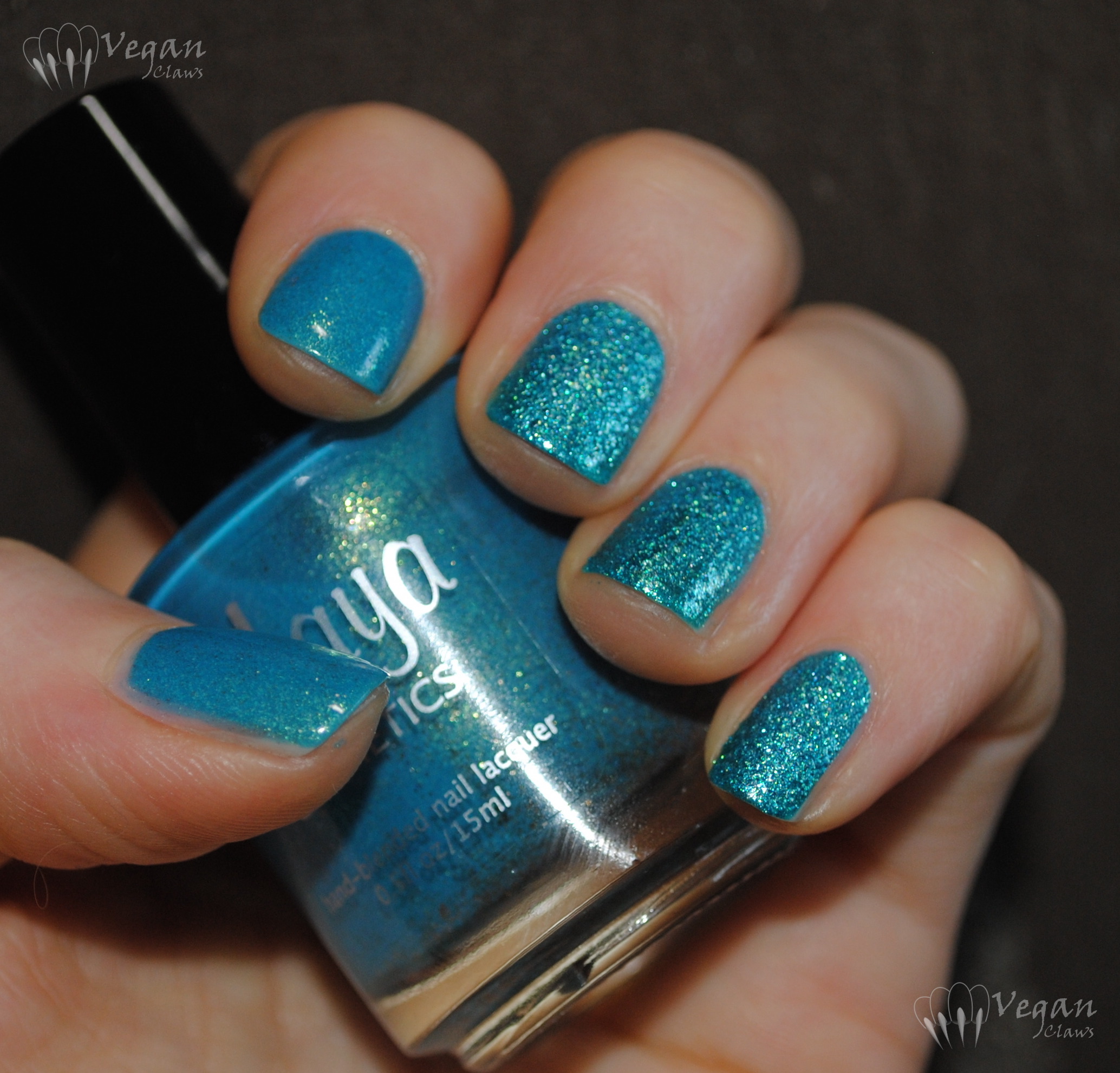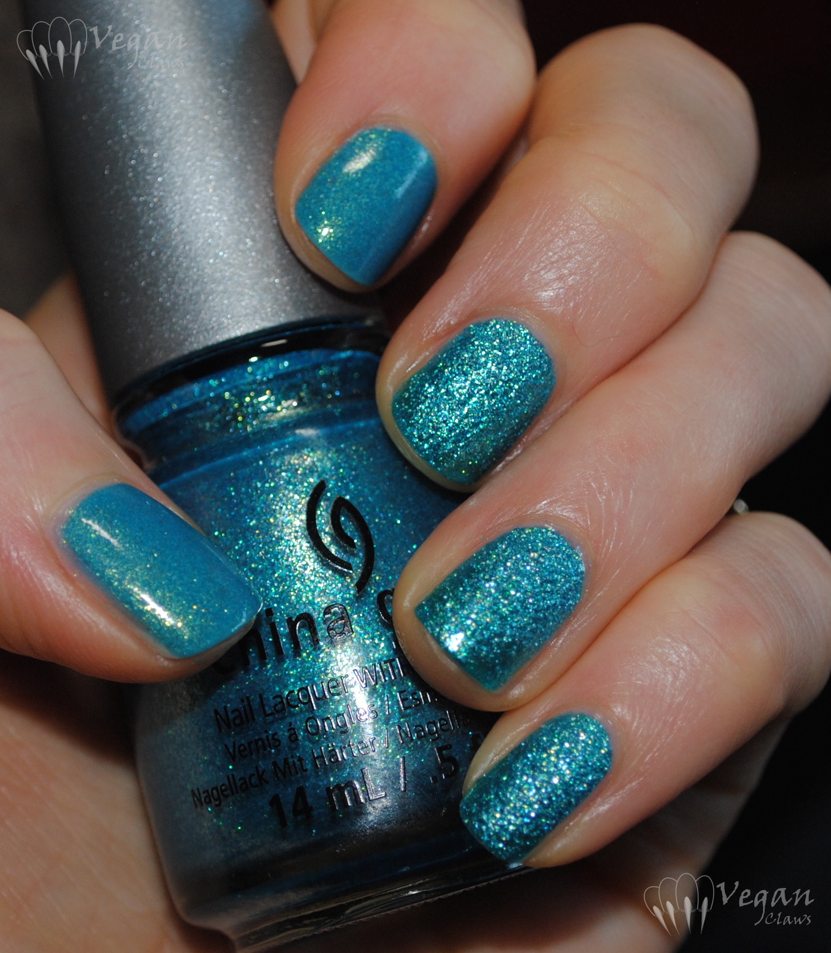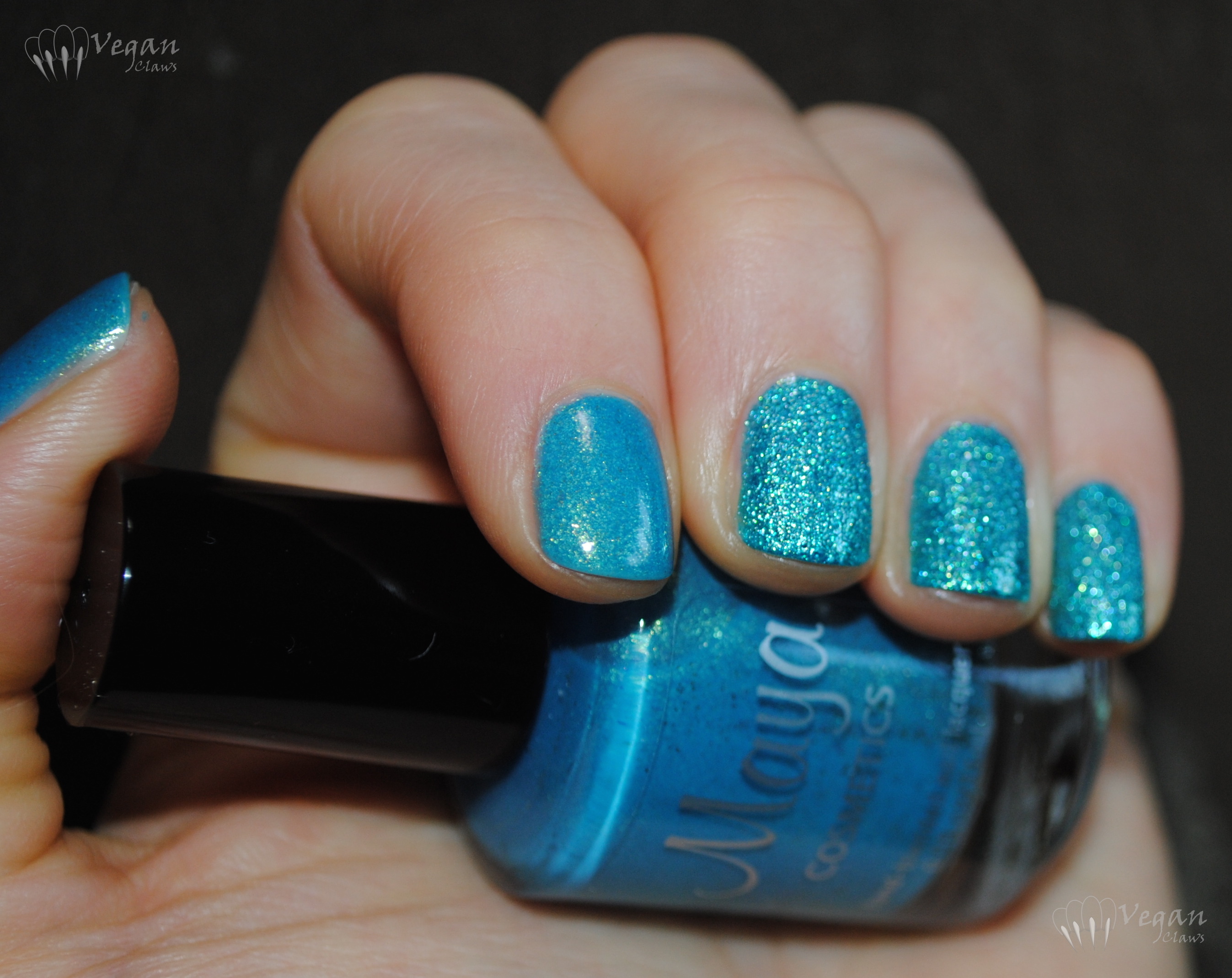 Another mani from last year, another Maya Cosmetics polish! This is Maya Cosmetics Reef, a great turquoise blue creme with heavy gold flakes, shown in two coats plus top coat. The texture polish is China Glaze Seahorsin’ Around, also two coats. Under Ott Lite: