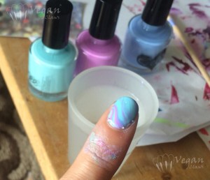 Oh and the little cup I’m using is the China Glaze shot glass from one of their holiday sets a few years ago. π I also used Sticky Paws liquid latex from Eat Sleep Polish around my nail for clean up; clearly on my first try there I didn’t go far enough down my finger so I added more for the next tries! I should also mention that as base for all the watermarbled nails shown here, I used one generous coat of Milani White On The Spot.