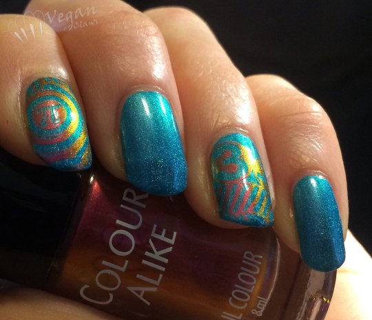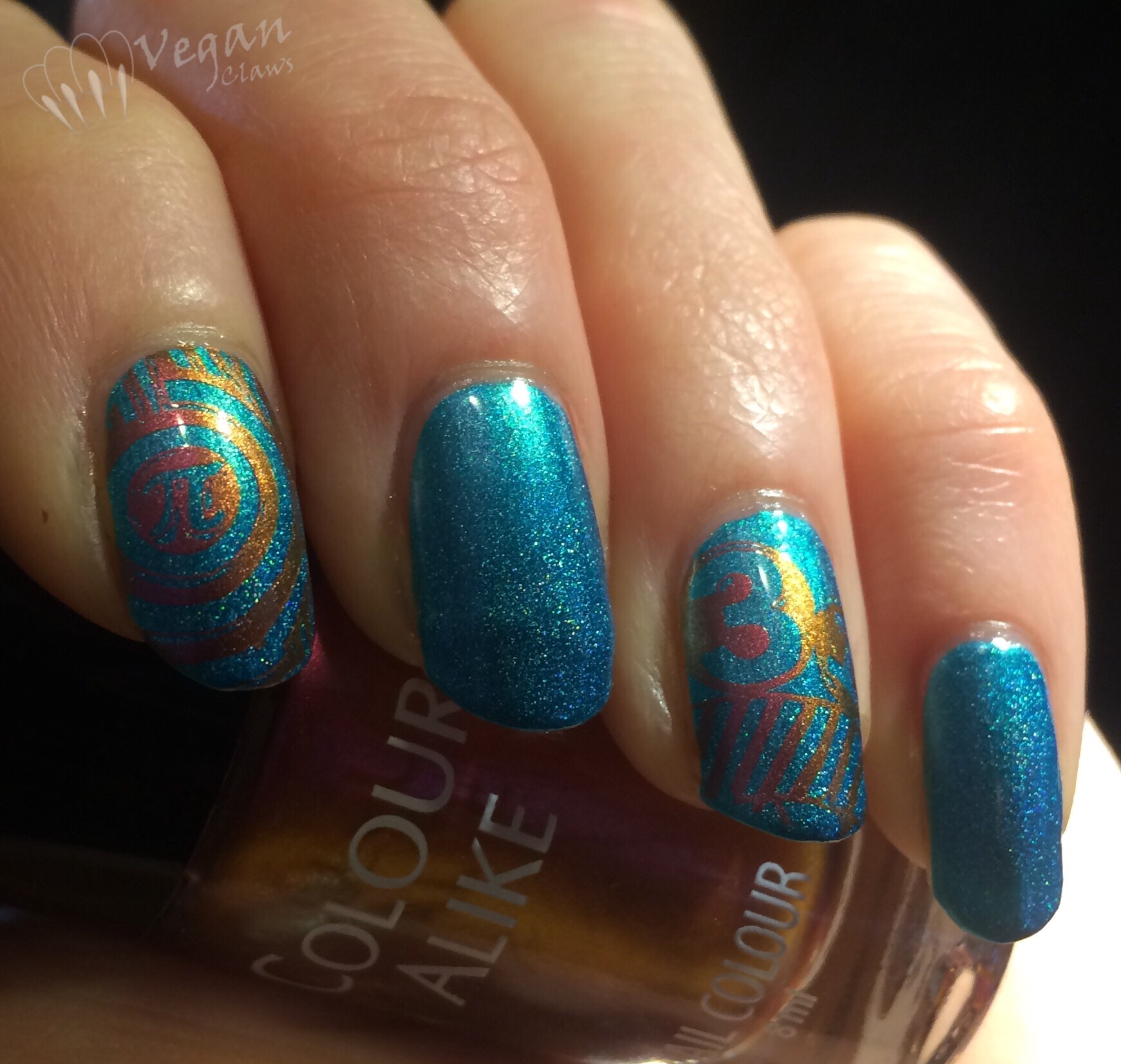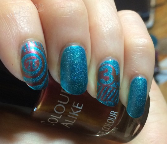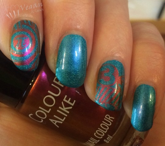 For Pi Day I stamped over A England Whispering Waves using Hehe plate Hehe-053 and Colour Alike “a Venus”. Only had time to do a couple of nails with the Pi-themed stamping plate…