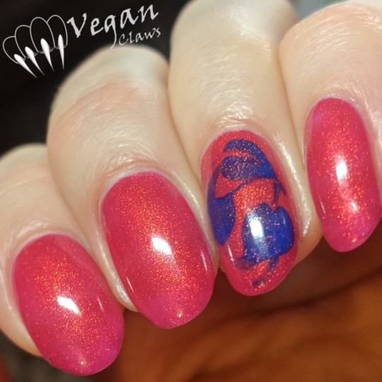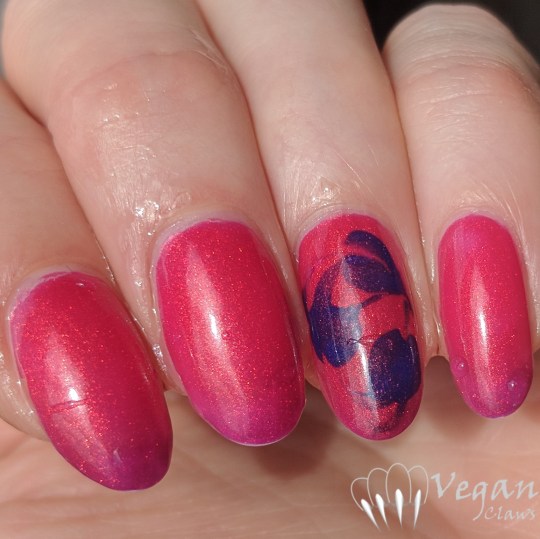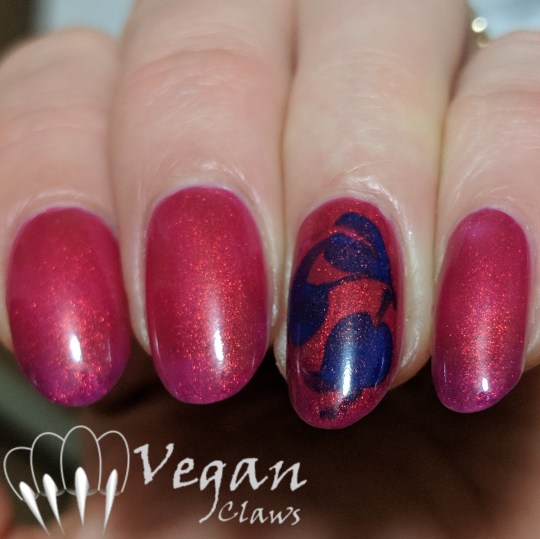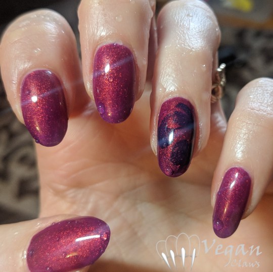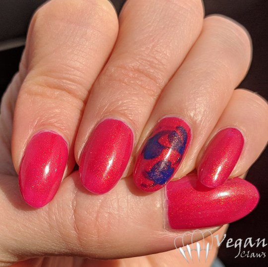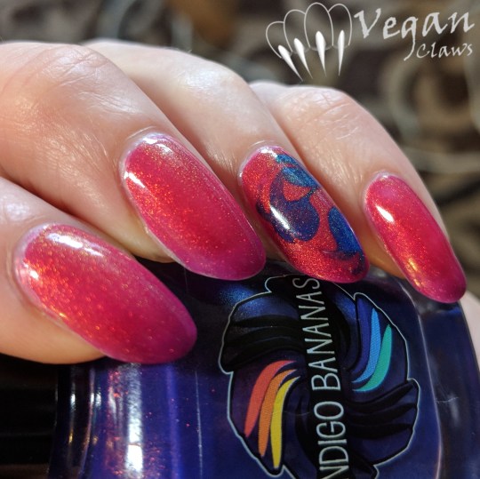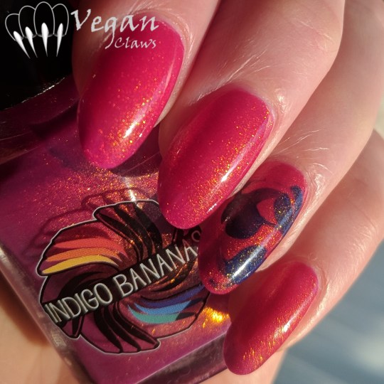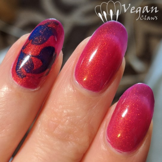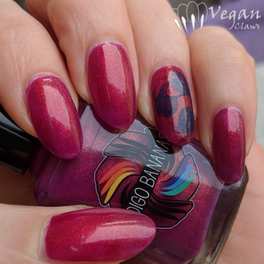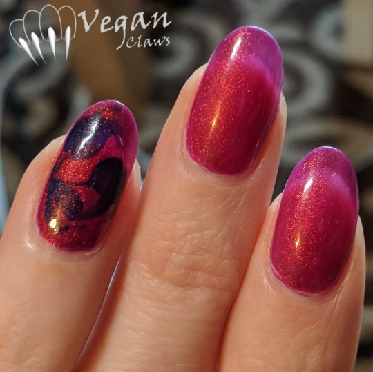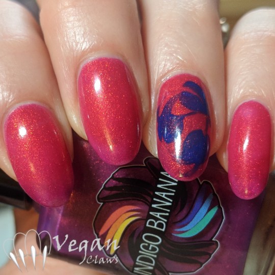 Indigo Bananas Cherry Pie with a needle marbled accent using Blue Rose. These two are thermal polishes with colour shifting “unicorn pee” pigment. Two coats except on the accent nail. Probably should have used three coats… Pics in various different lighting (and temperature)!