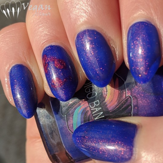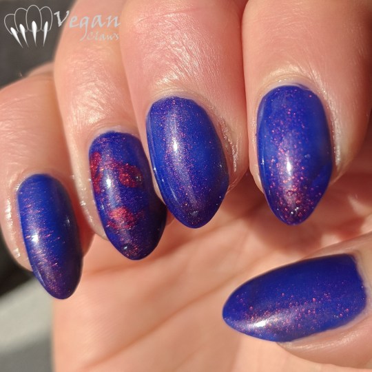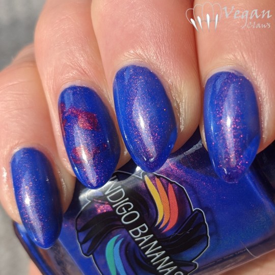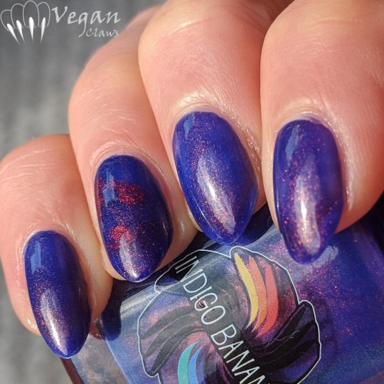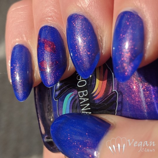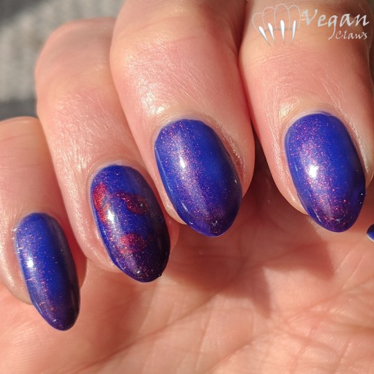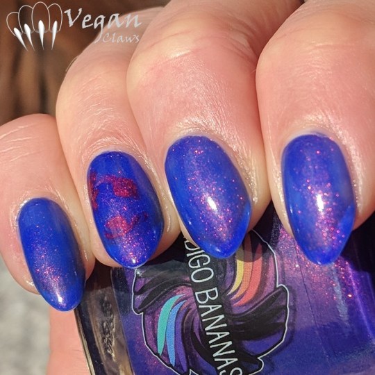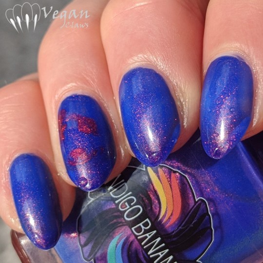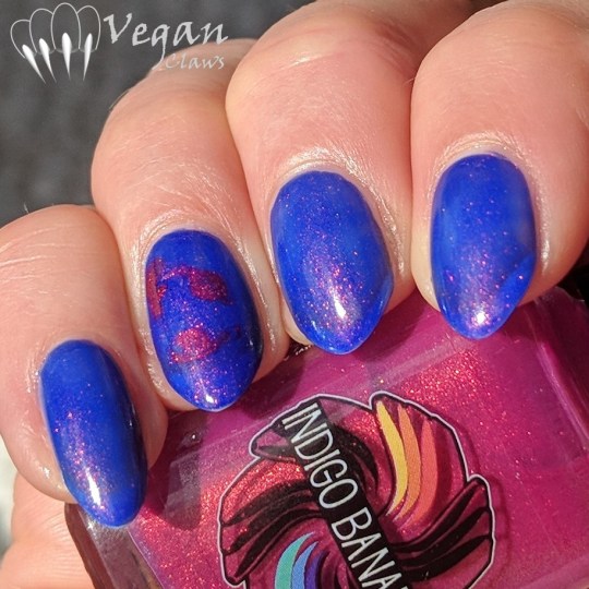 Companion post to yesterday’s, on my other hand I did the opposite version of the mani – Indigo Bananas Blue Rose with a needle marbled accent using Cherry Pie. Thermal polishes with colour shifting “unicorn pee” pigment. Two coats except on the accent nail. Again, probably should have used three coats since there are some bald spots visible in the warm state… Pics in various different lighting (and temperature)!