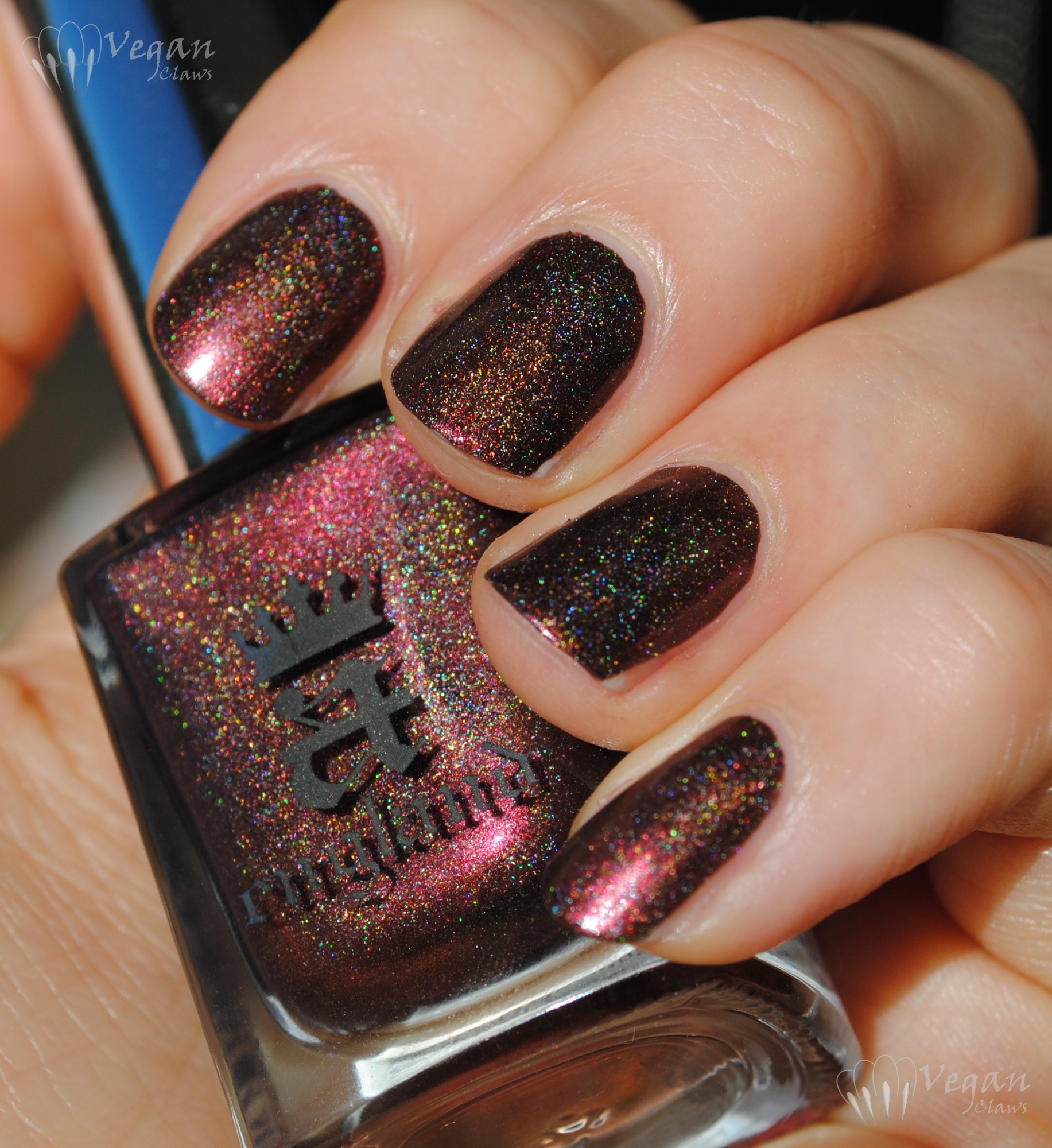 Shown in three coats, no top coat. It was a little patchy over my ridgey nails but not too bad. This next shot shows off the multi-coloured glass flecks in the bottle.