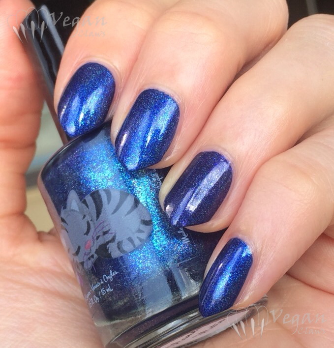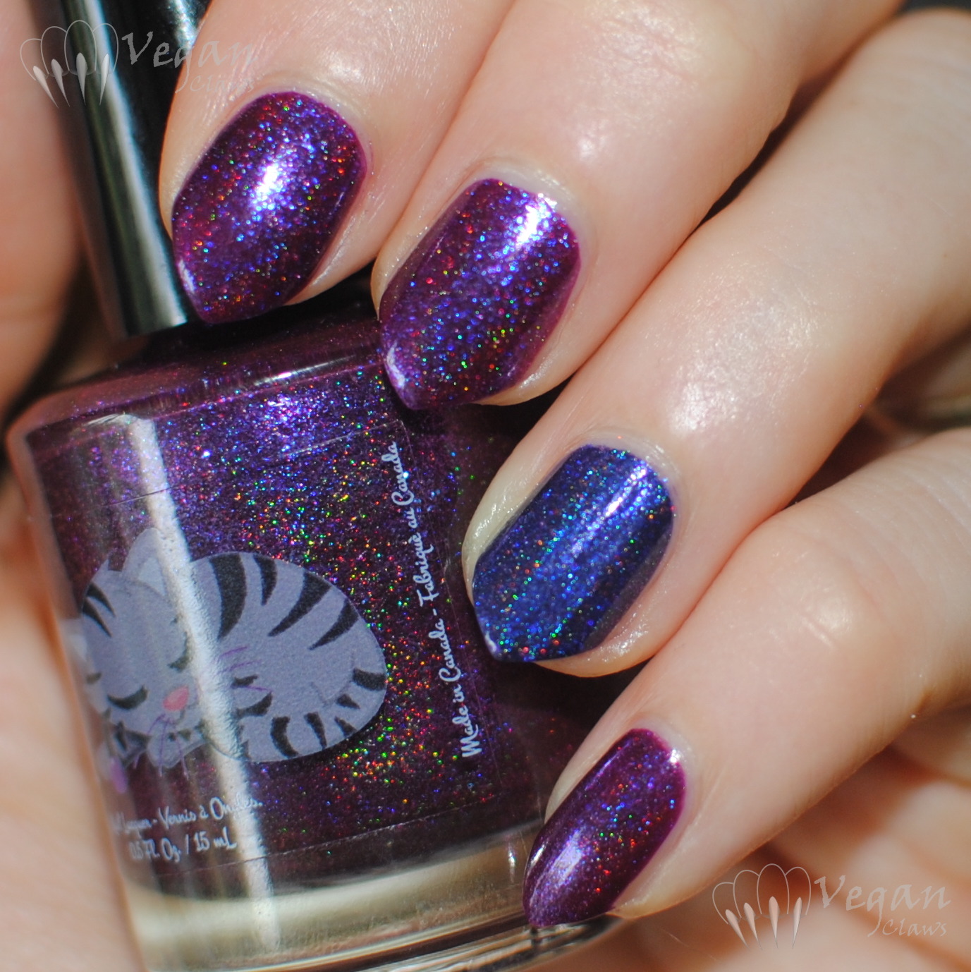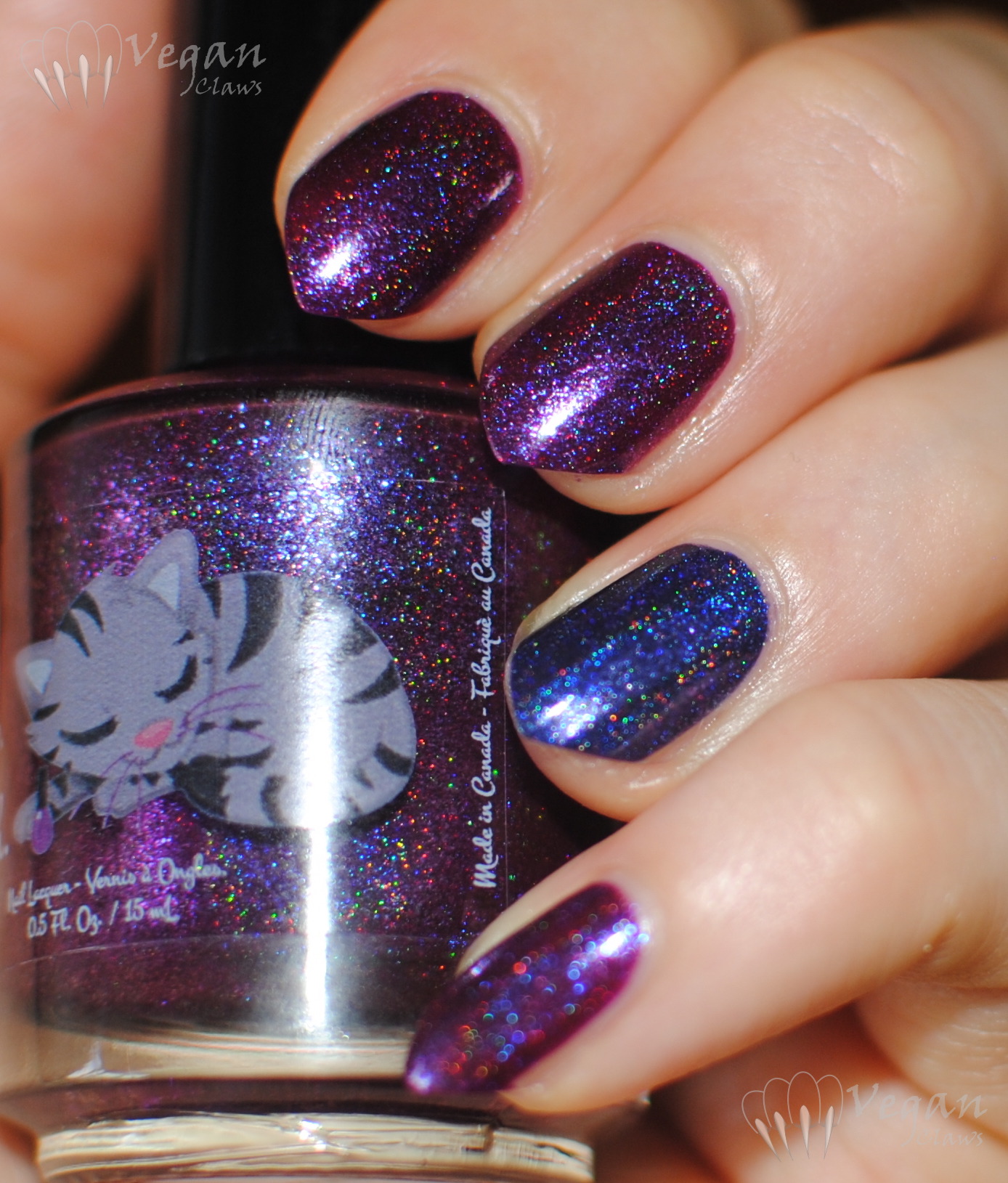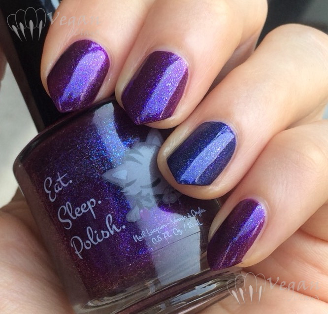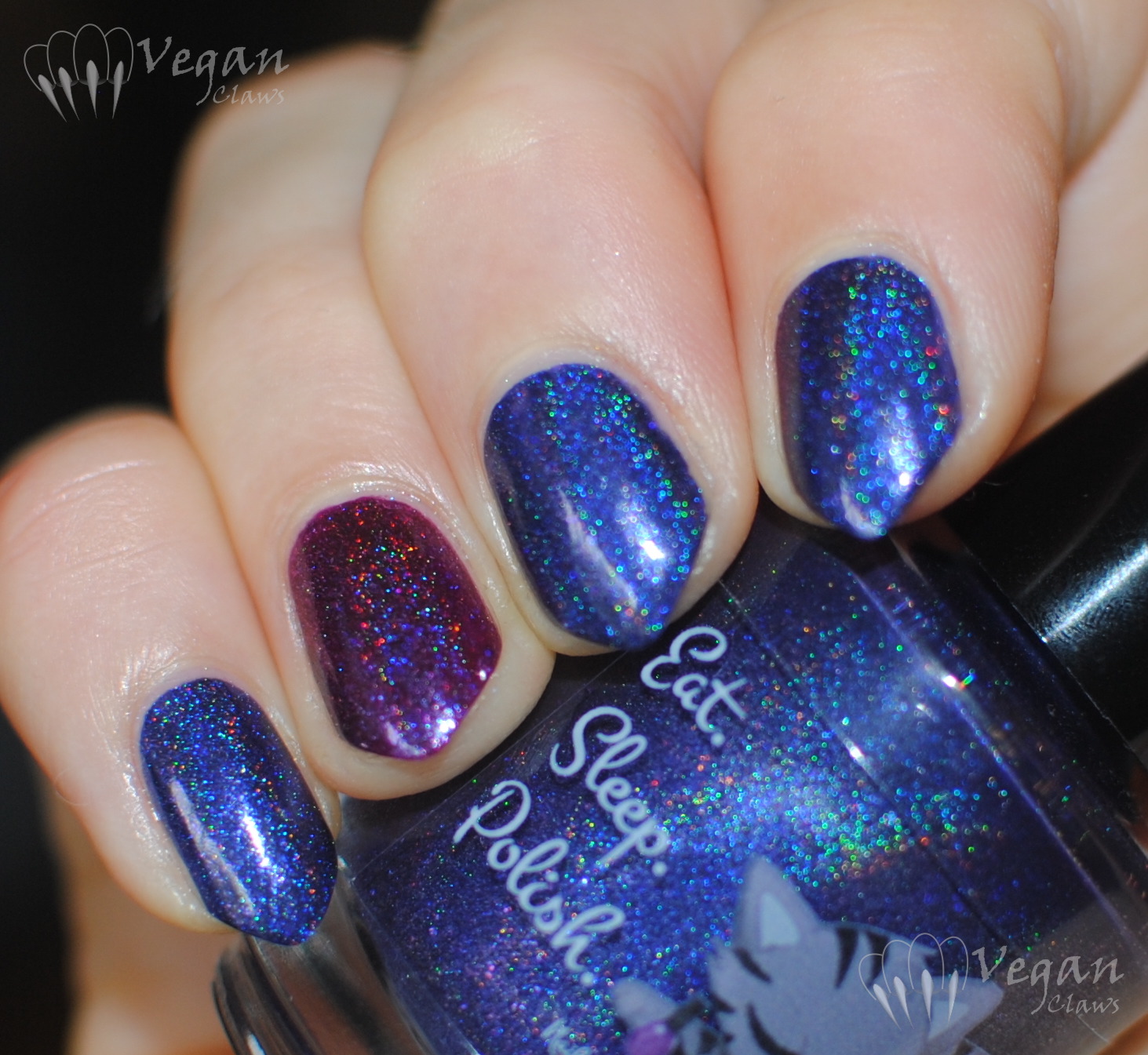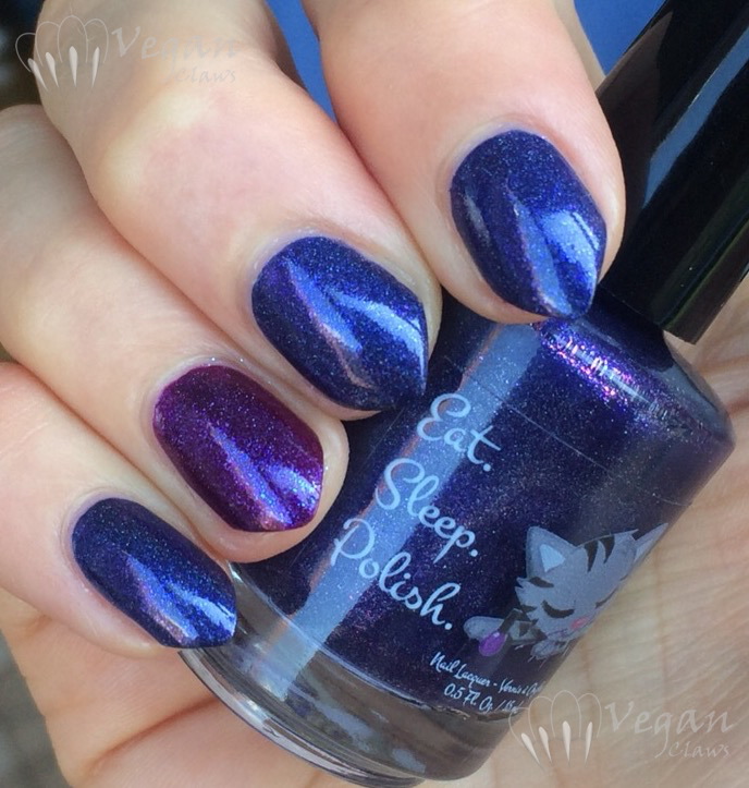 Today I have three Eat Sleep Polish holos with colour-shifting glass flecks to show you. First, Supernova with an accent nail of Jupiter Grapes. Supernova is a fuchsia/plum sort of shade with blue-to-fuchsia glass flecks. Jupiter Grapes is a slightly blue-toned purple with similar blue-to-fuchsia glass flecks, although they don’t appear as prominent as in Supernova. Under Ott lite: