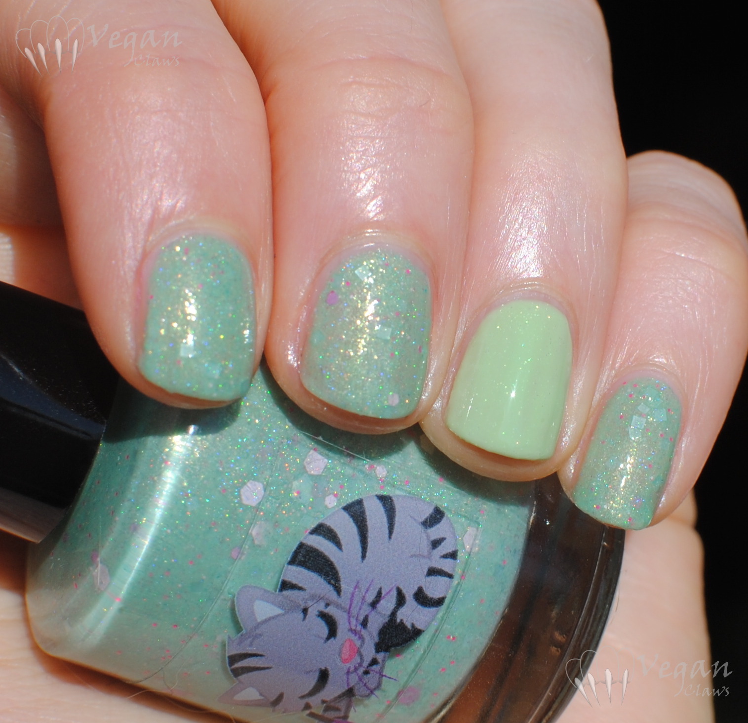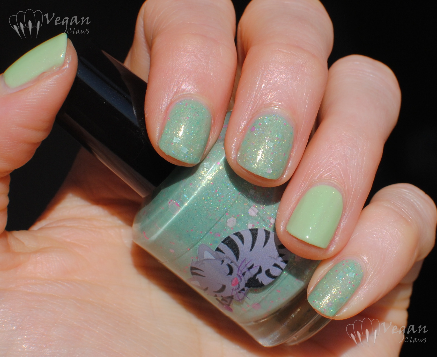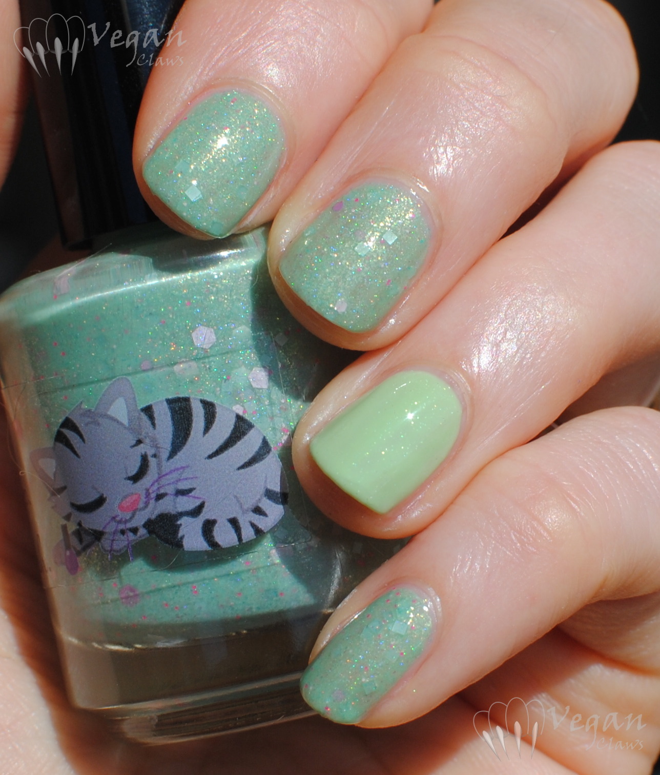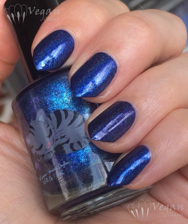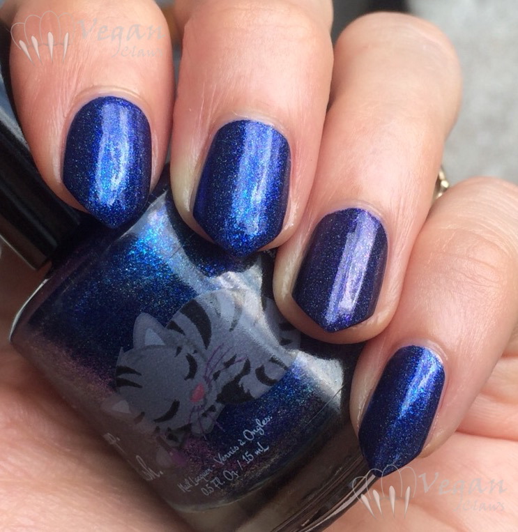Today I have three Eat Sleep Polish holos with colour-shifting glass flecks to show you. First, Supernova with an accent nail of Jupiter Grapes. Supernova is a fuchsia/plum sort of shade with blue-to-fuchsia glass flecks. Jupiter Grapes is a slightly blue-toned purple with similar blue-to-fuchsia glass flecks, although they don’t appear as prominent as in Supernova. Under Ott lite: