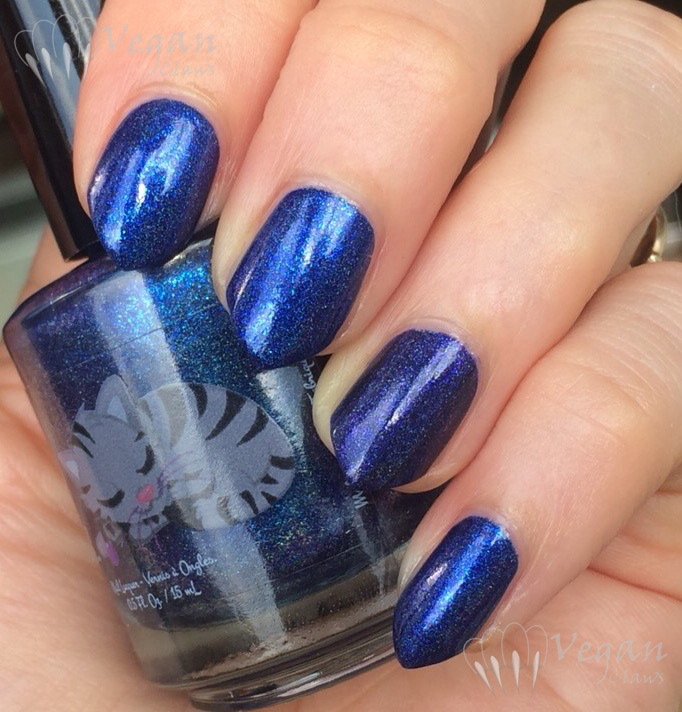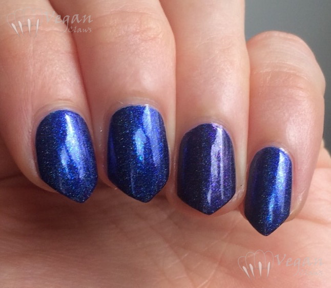 Later I decided to compare Jupiter Grapes and Planet Pluto, which is an indigo-toned blue, again with glass flecks that mostly appear blue in this polish. Here is Planet Pluto with a ring finger accent of Jupiter Grapes, in sunlight:
