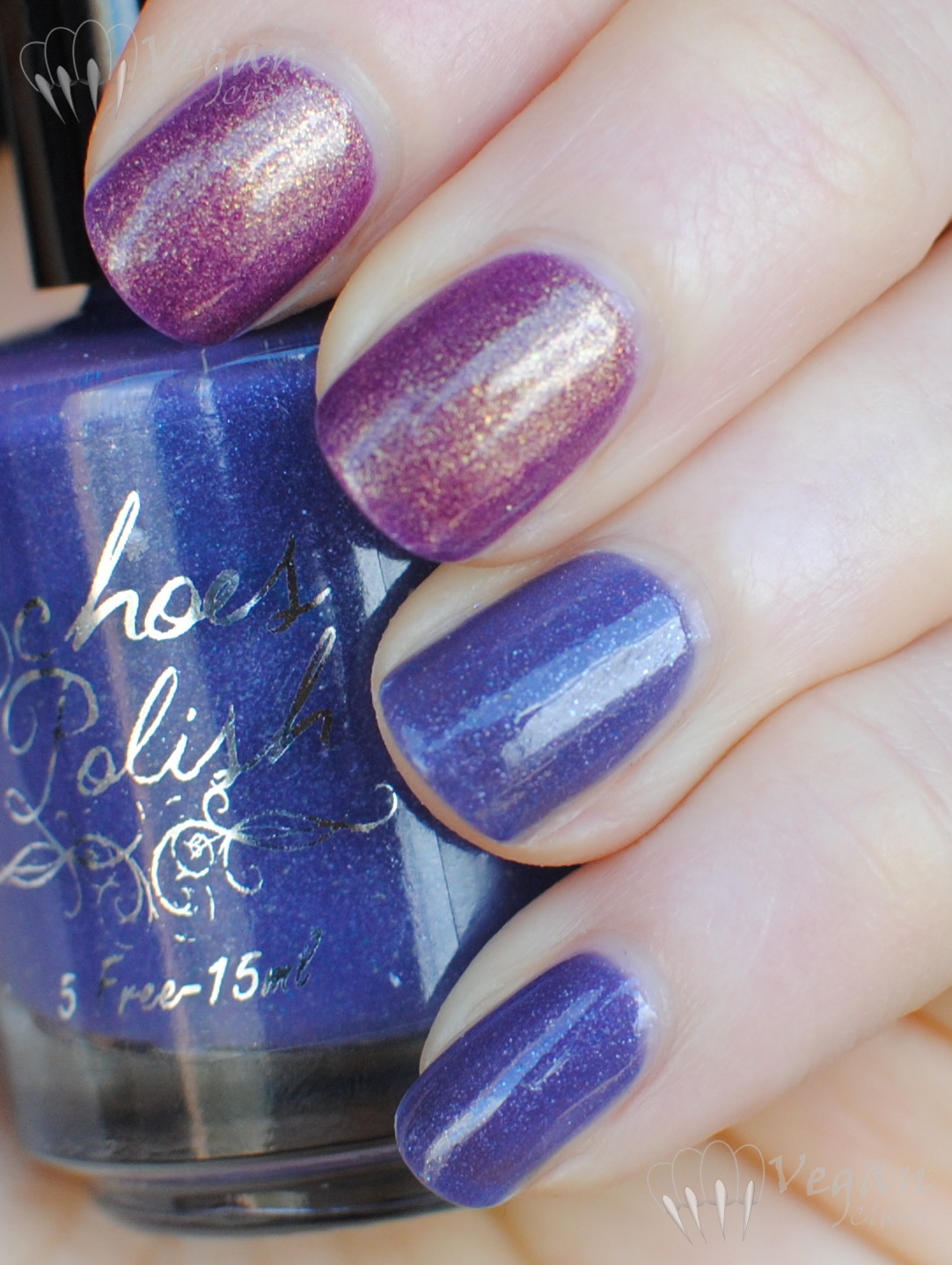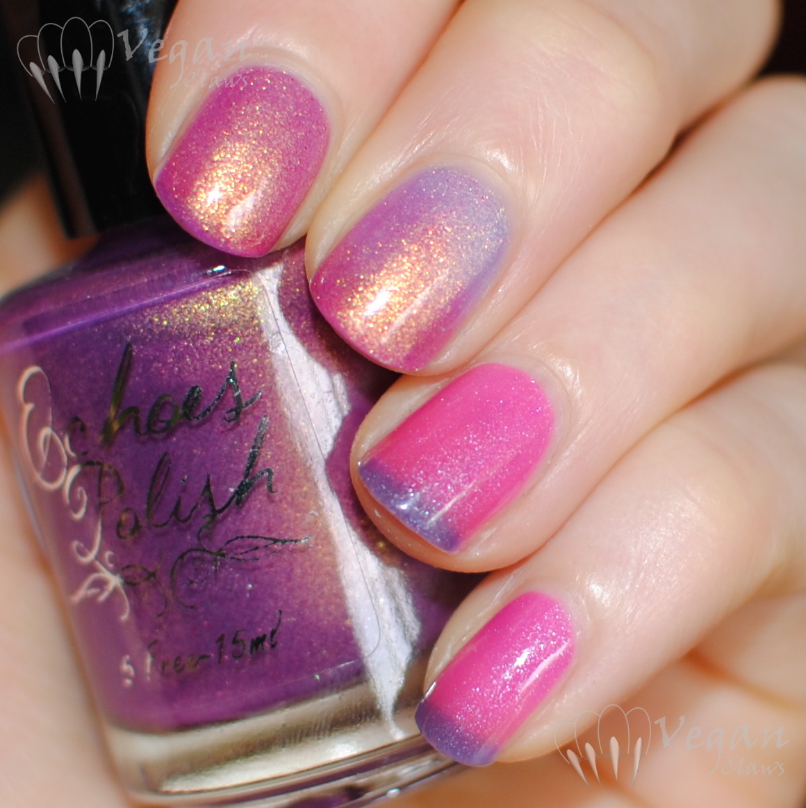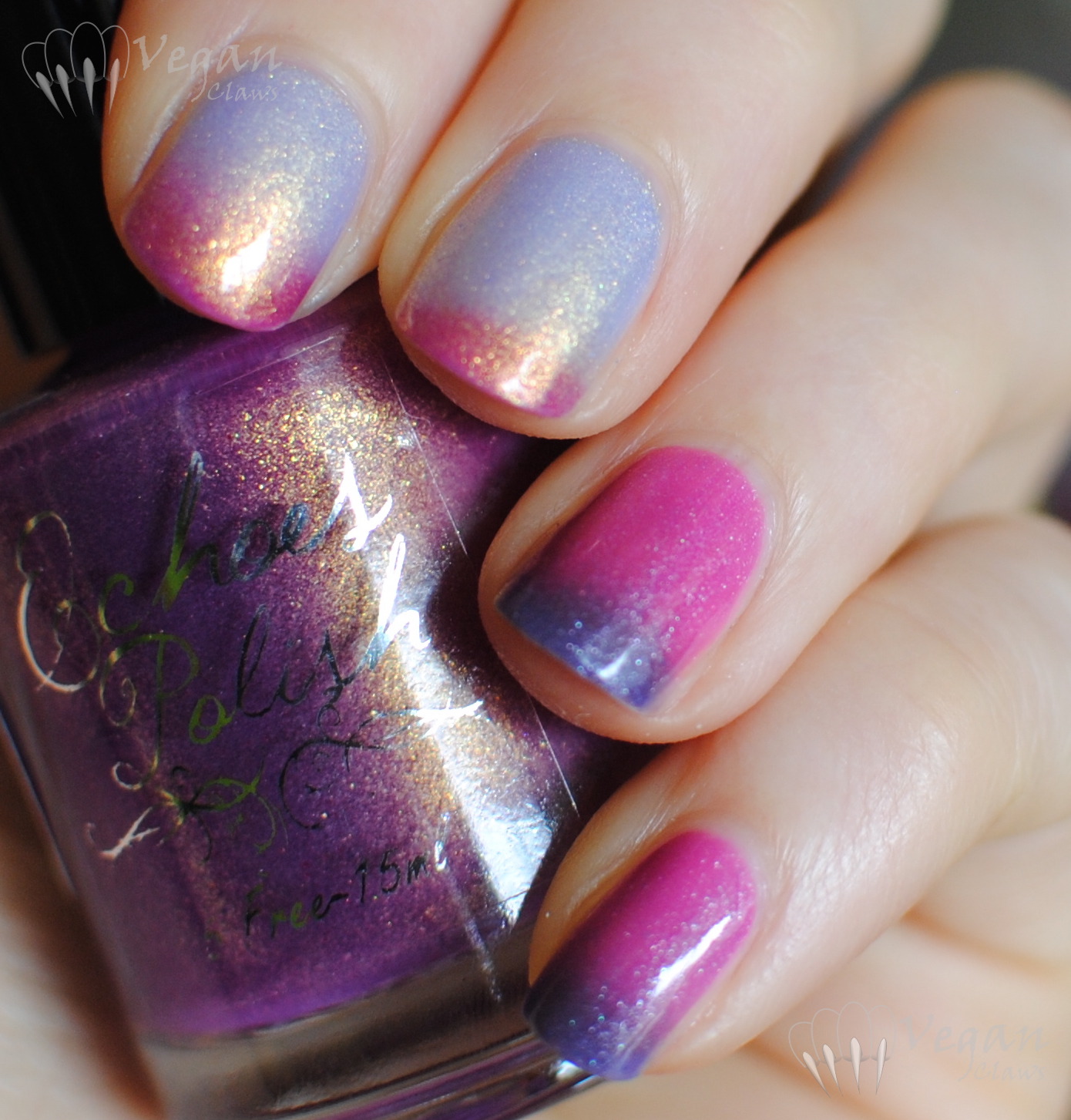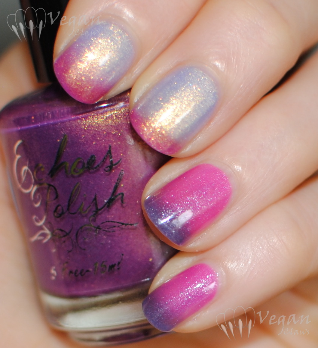 I have two thermals from Echoes Polish to show you today! Happily Ever After is a tri-thermal shifting from a warm purple when cold to a fuchshia pink when warm to a very pale lilac-leaning blue when hot, and has heavy gold flake shimmer throughout. The April 2015 Thank You thermal (Echoes polish creates a limited edition thermal each month and sends them out free in orders of 5 or more polishes) is a blue-purple when cold changing to a bright hot pink when hot, and also has shimmer.