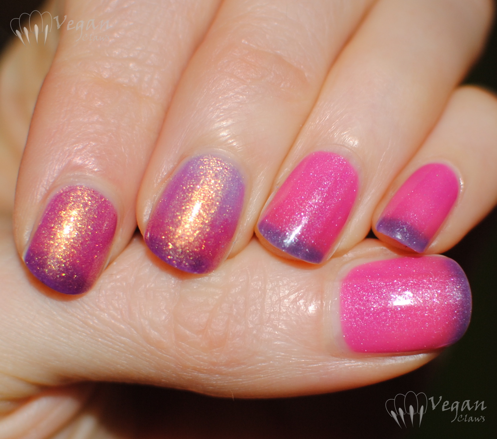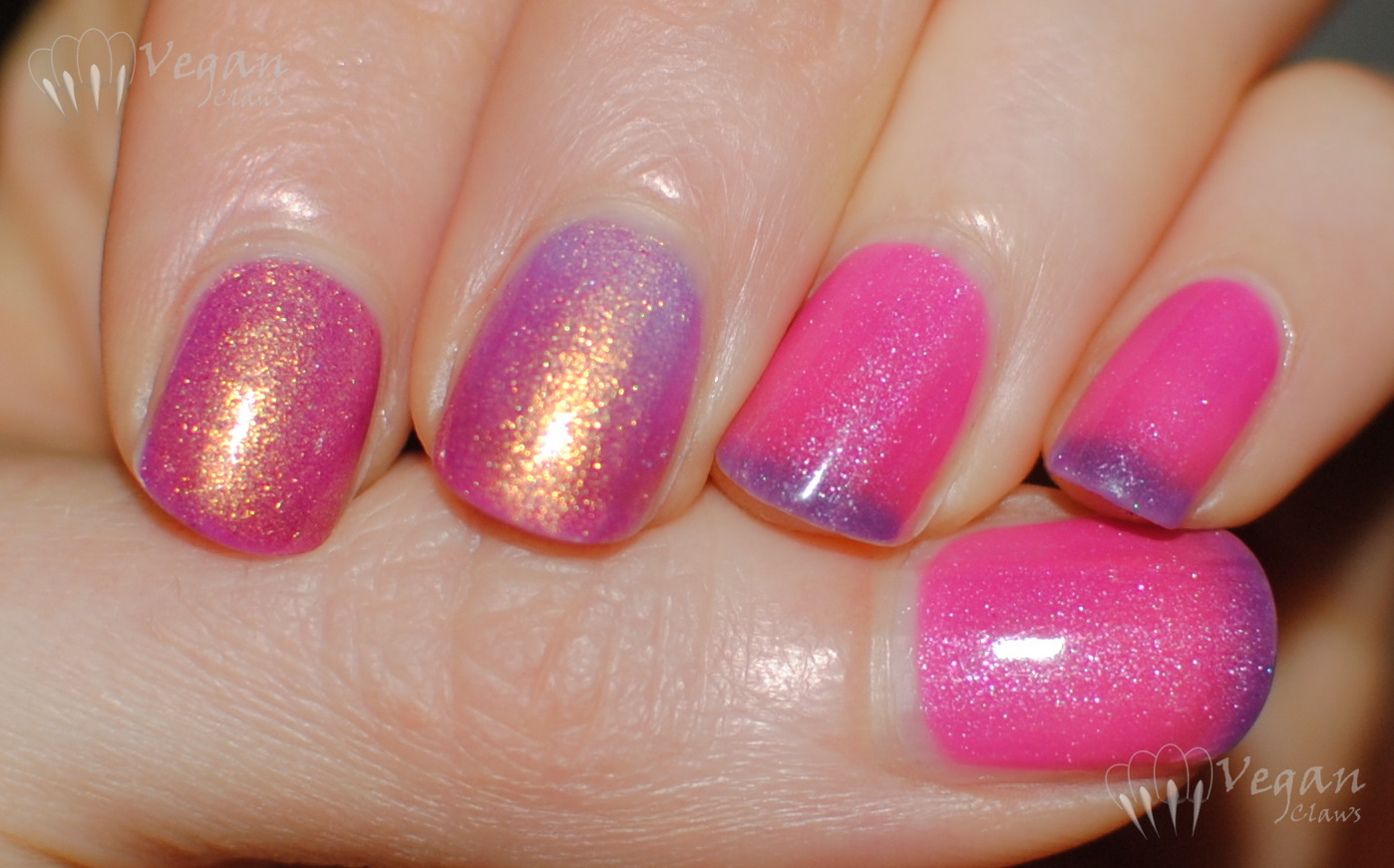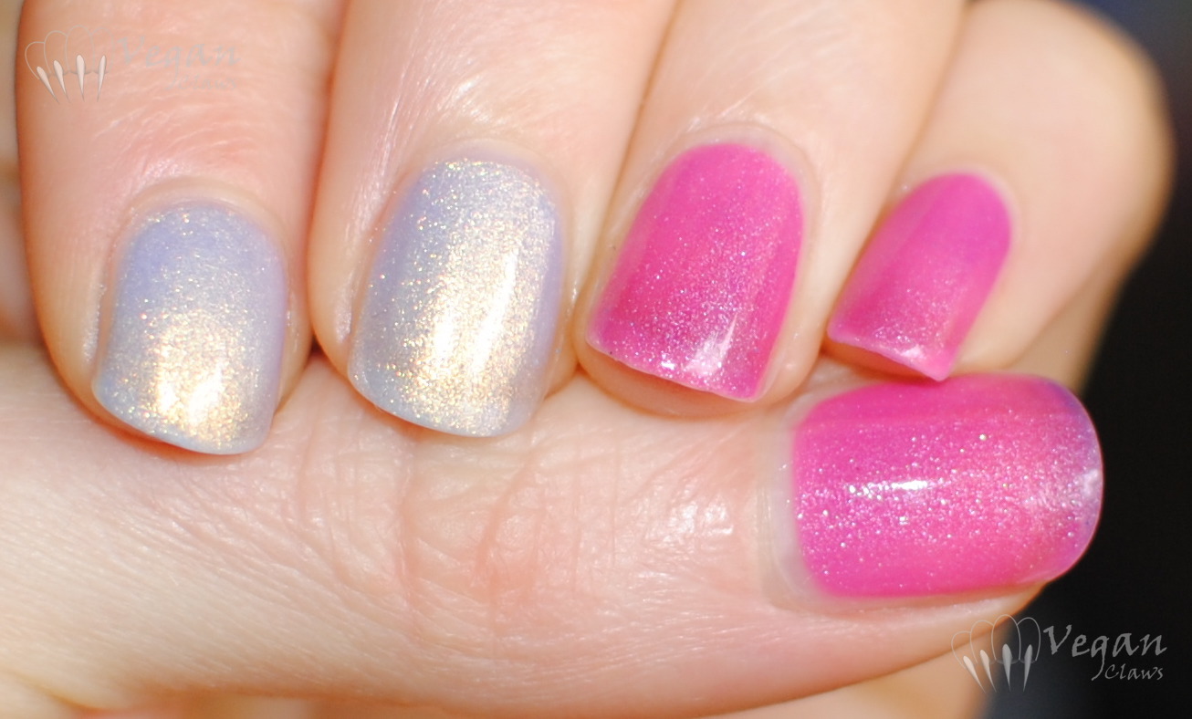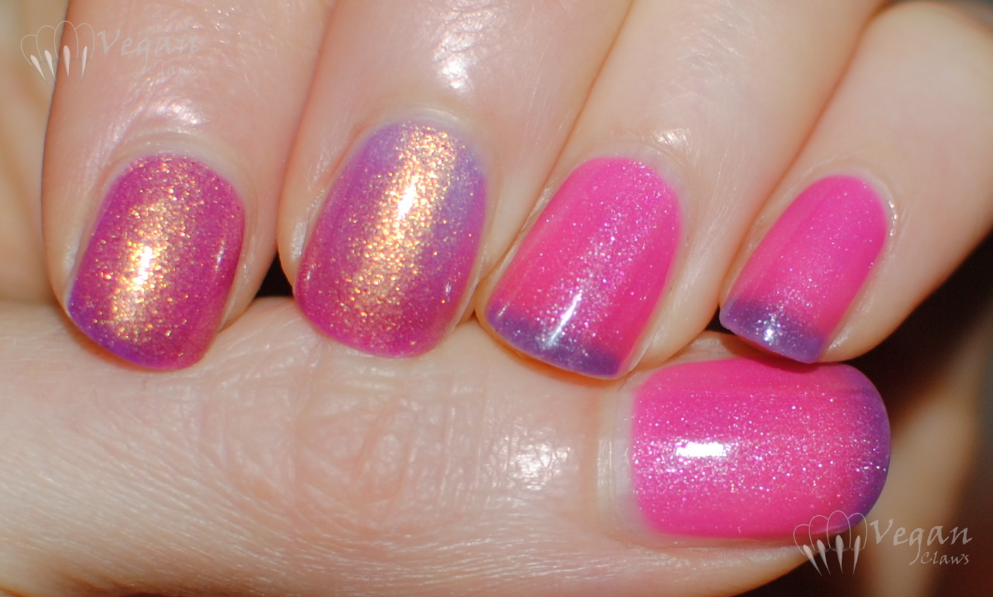 I have two thermals from Echoes Polish to show you today! Happily Ever After is a tri-thermal shifting from a warm purple when cold to a fuchshia pink when warm to a very pale lilac-leaning blue when hot, and has heavy gold flake shimmer throughout. The April 2015 Thank You thermal (Echoes polish creates a limited edition thermal each month and sends them out free in orders of 5 or more polishes) is a blue-purple when cold changing to a bright hot pink when hot, and also has shimmer.