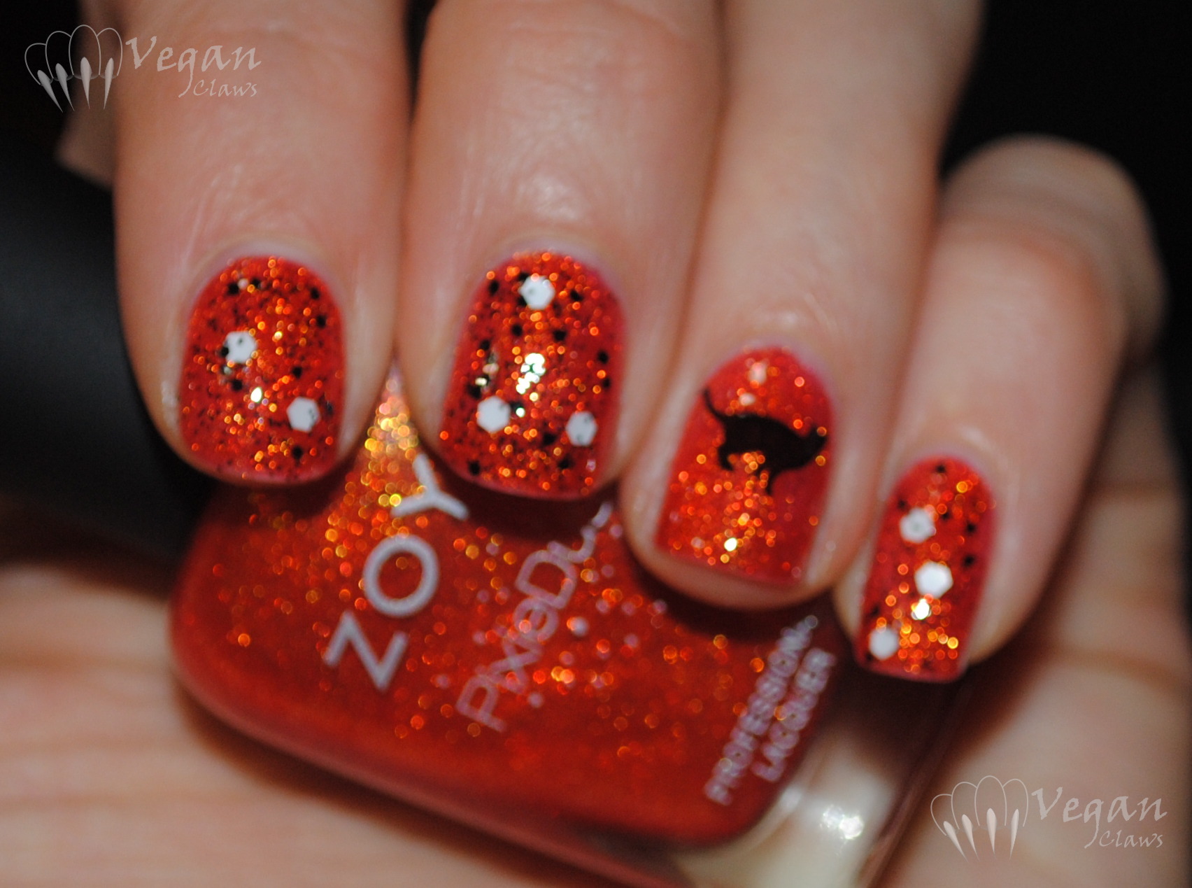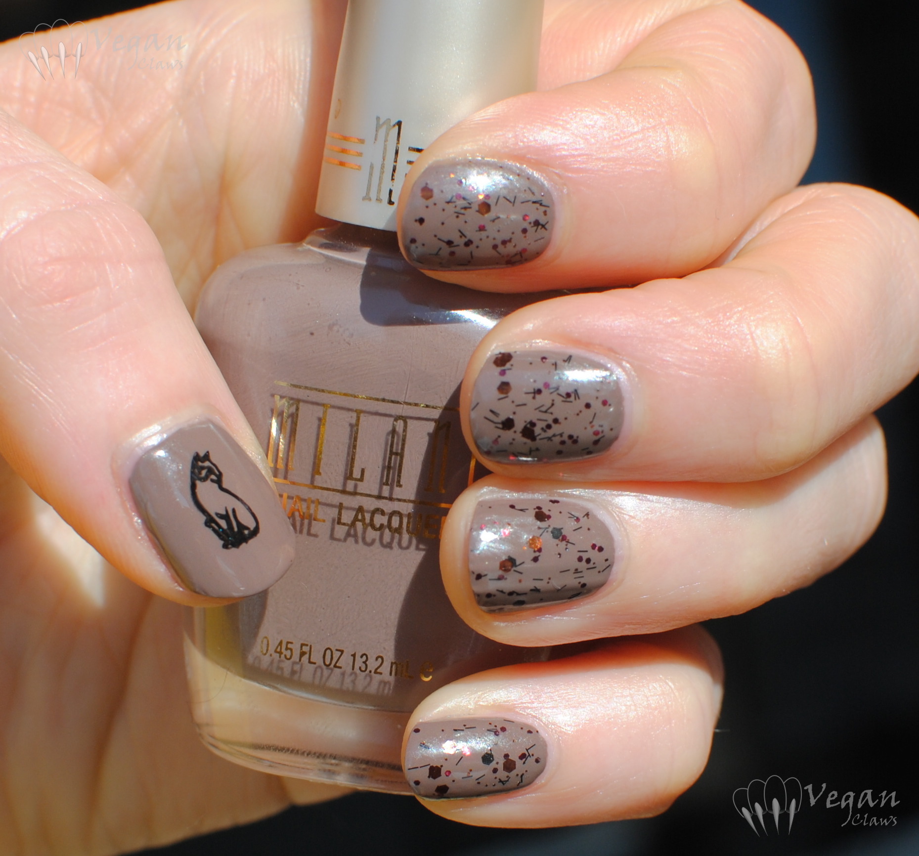 This is two coats of Classic Tabby, a clear-based glitter topper, over Milani Teddy-Bare. The cat stamp on my thumb is from plate HB49 and is done with Kleancolor Black.