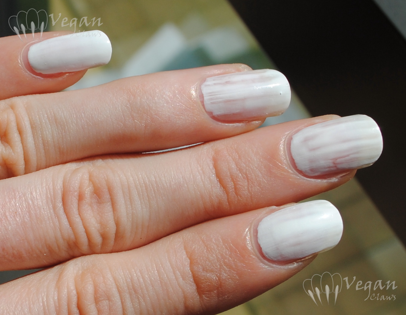 This first photo shows one coat of each polish, index to pinkie (bottom to top) in the same order as the bottles. I applied them all with a fairly thick coat (basically just not wiping off the brush on the bottle rim before applying), since whites and pastels usually benefit from a light touch rather than applying a lot of very thin coats which tend to go on streakier.
