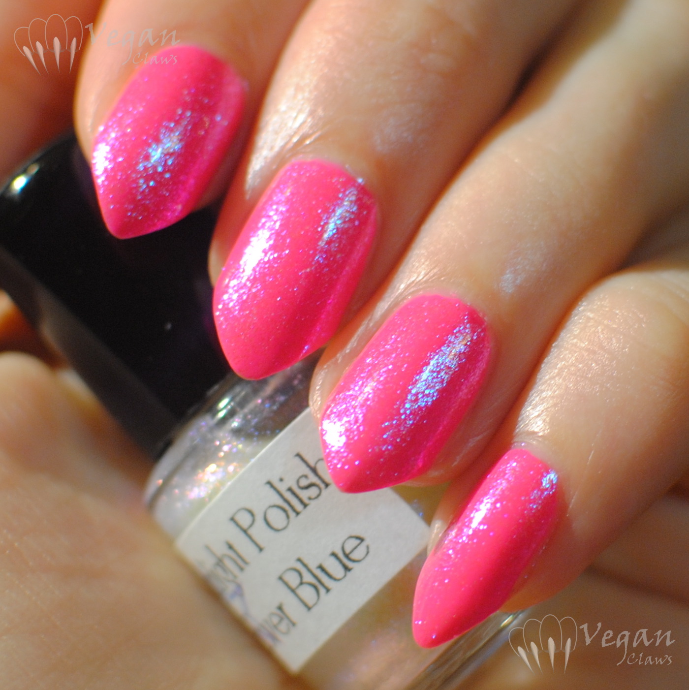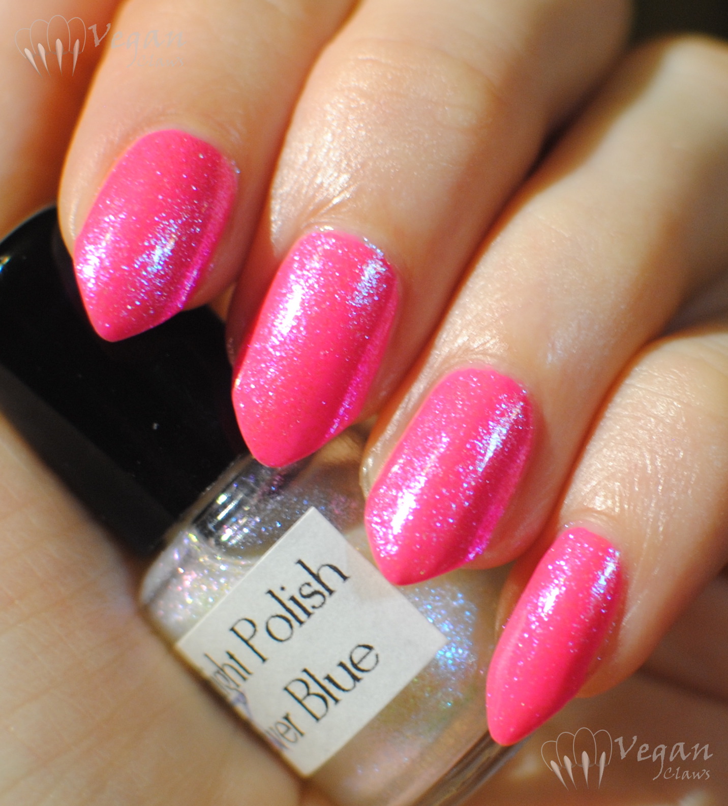 Here’s a layering combo I did using Kleancolor Neon Pink and Starlight Polish Ever Blue, a glass-fleck topper that shifts from blue to pink. Two coats of the Kleancolor followed by one coat of Ever Blue and topcoat. With flash: