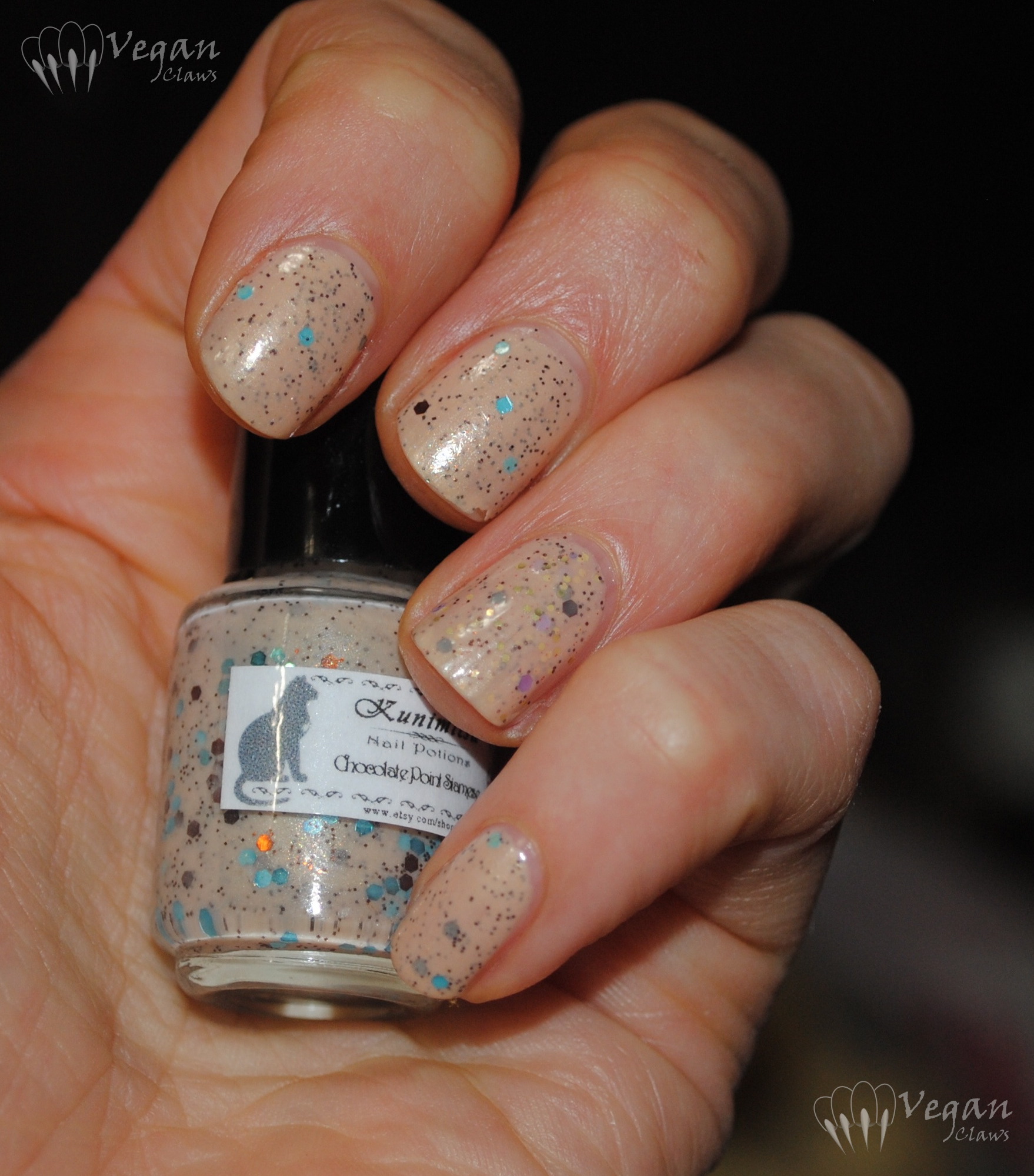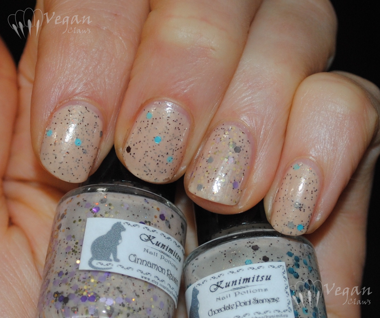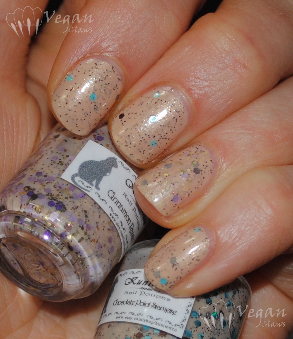 Chocolate Point Siamese is a nude beige slightly shimmery base with brown and holo light blue medium hex glitter, very small brown glitter, and tiny gold sparkles. Cinnamon Raisin has the same base and the two sizes of brown glitter, but also purple and lilac medium hexes and small gold hexes. They both seem to have some holo microglitter in there too, but it’s sort of hard to tell! But there are tiny little flashes of holo-looking sparkle sometimes.