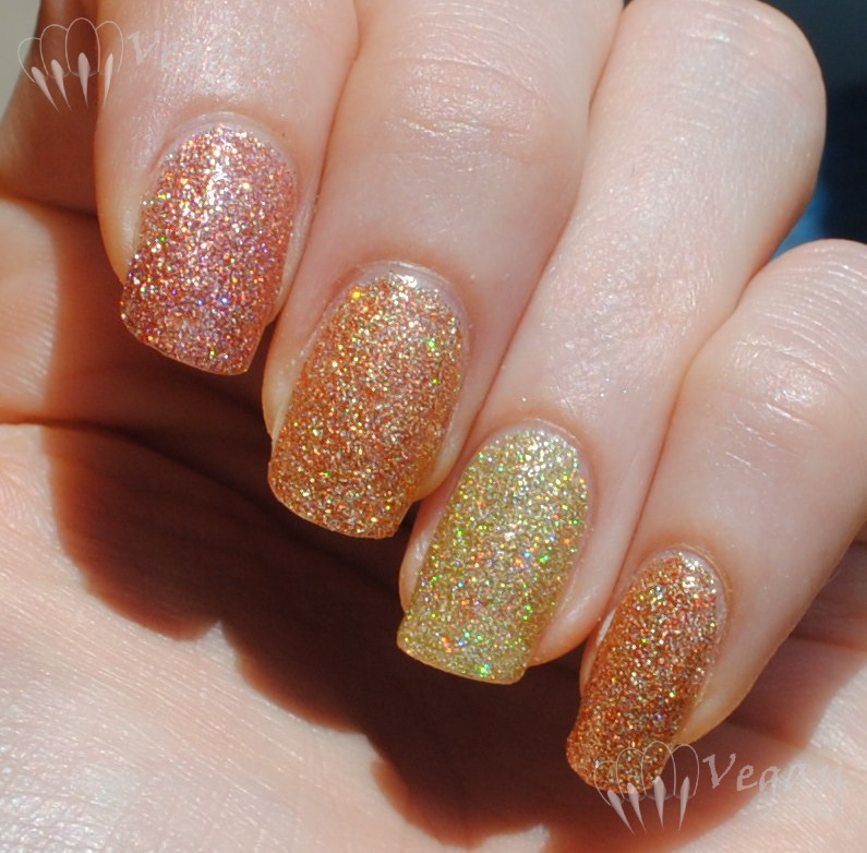 This first one is a fall mani that I really loved! Thumb to pinkie: Finger Paints Sketchy Character, a mustard yellow frankenpolish, Kleancolor Fashionista, China Glaze Brownstone, Joe Fresh Pumpkin. The glitter gradient over everything was done with Nubar Lime Green Glitter and Orange Glitter.