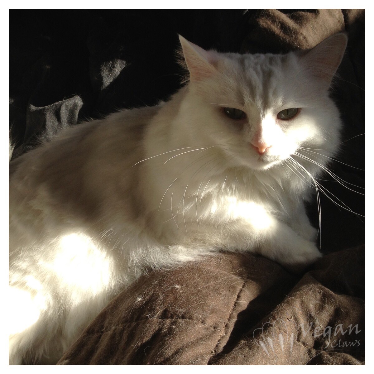 And now some photos of my semi-feral Jasmine: a collage with her sitting in a box and with her brother Thor, with whom she’s very close (and Julius lolling about in the background of one!) , and then one of her on the bed (she was actually leaned up against my leg when I woke up from a nap!)