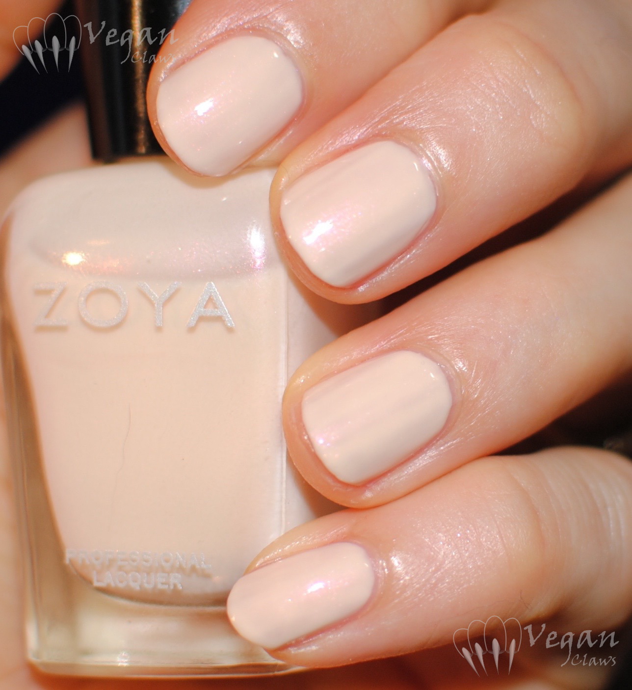 Zoya Blossom, a slightly peachy off-white with fine pink shimmer. I’m not sure if this was three or four coats; I apparently forgot to write it down! I did write down that the formula was a little thin (which makes me think it’s probably four coats) but surprisingly un-streaky for a white! Under Ott lite: