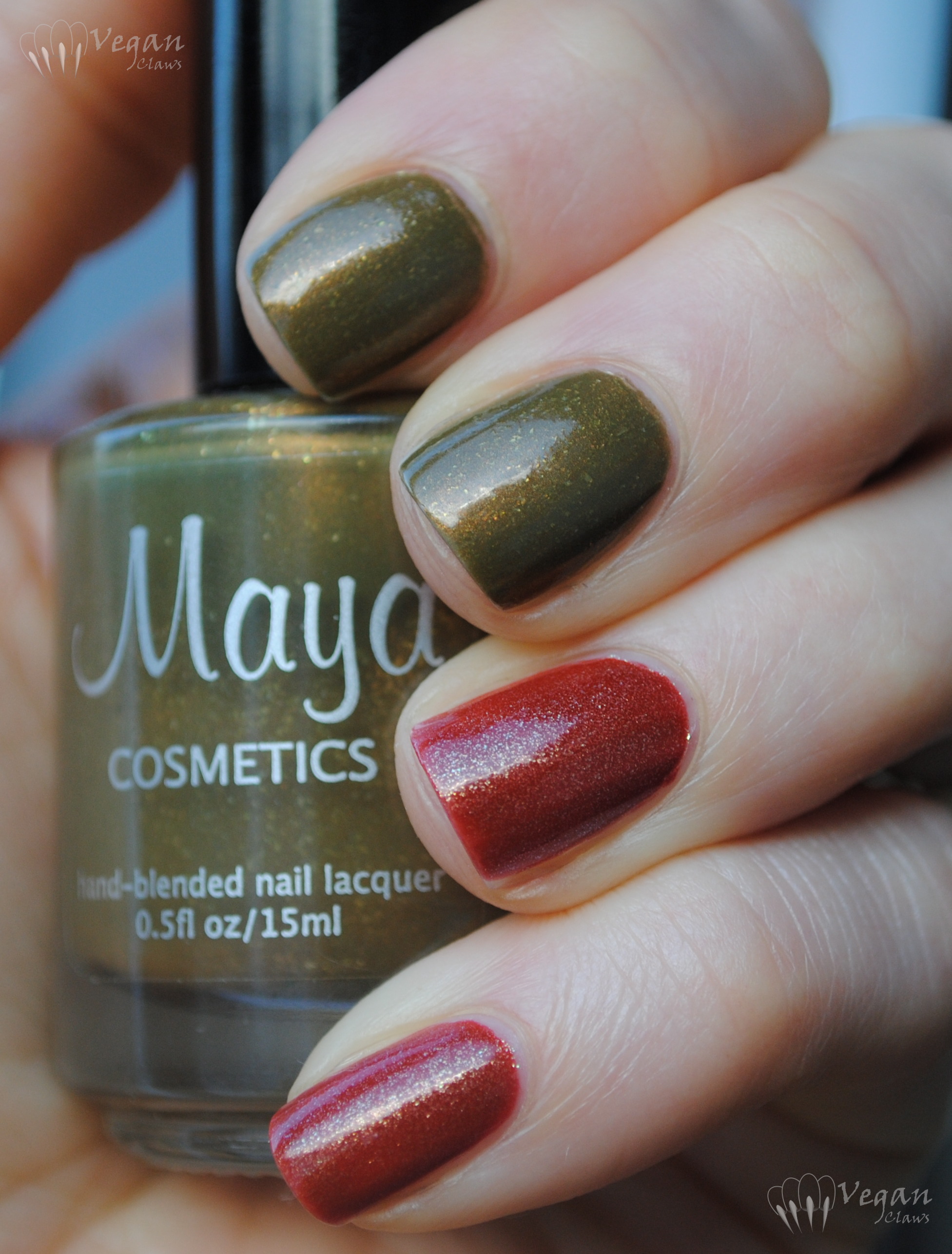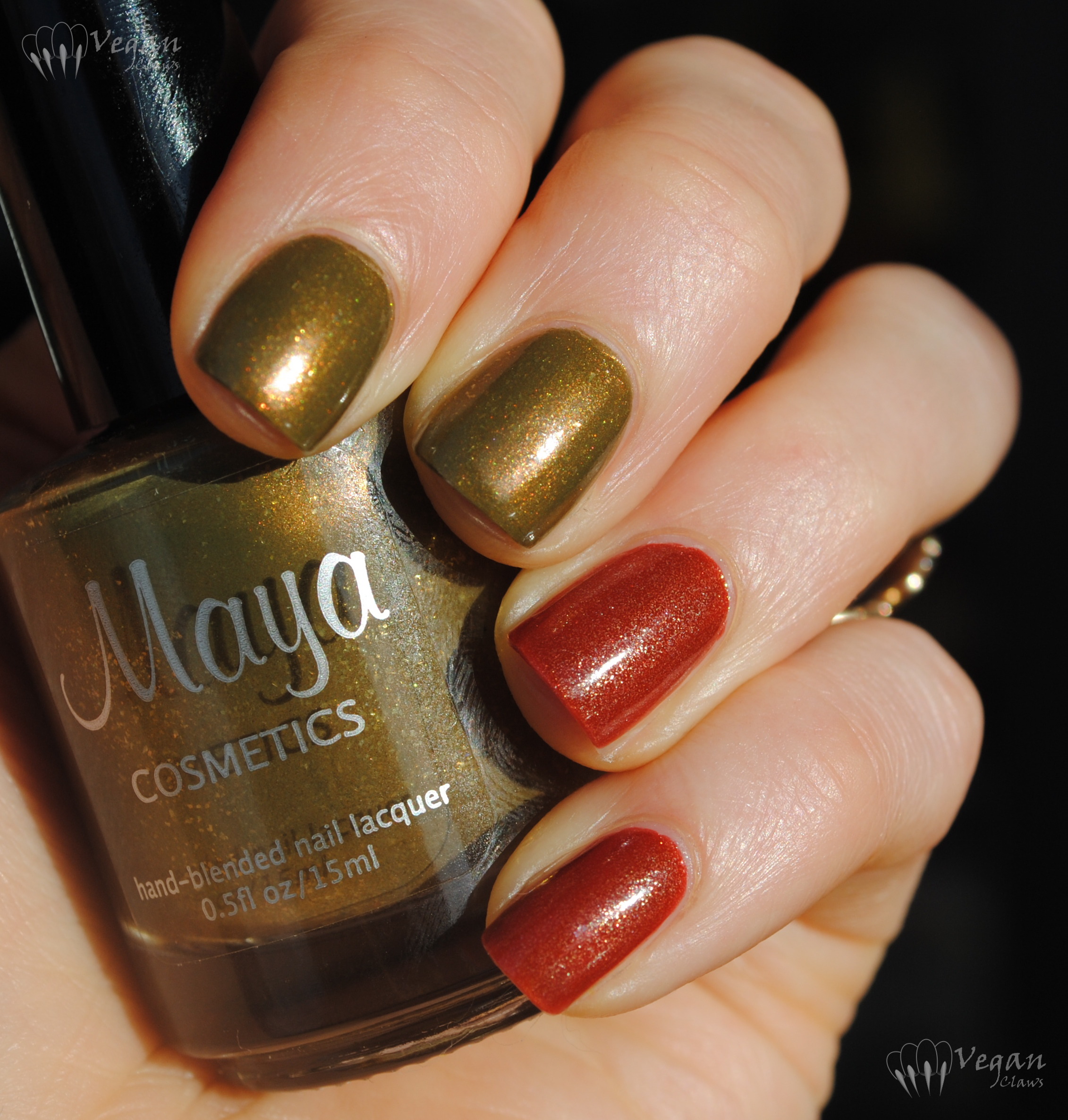 The olive green is Hex from the now-defunct Maya Cosmetics, and the orangey-brown brick colour is Pretty Serious Martian Sea. Two coats each. Sunlight: