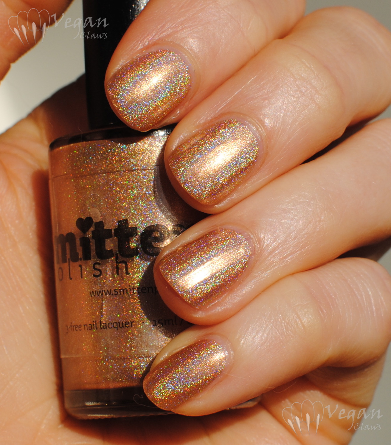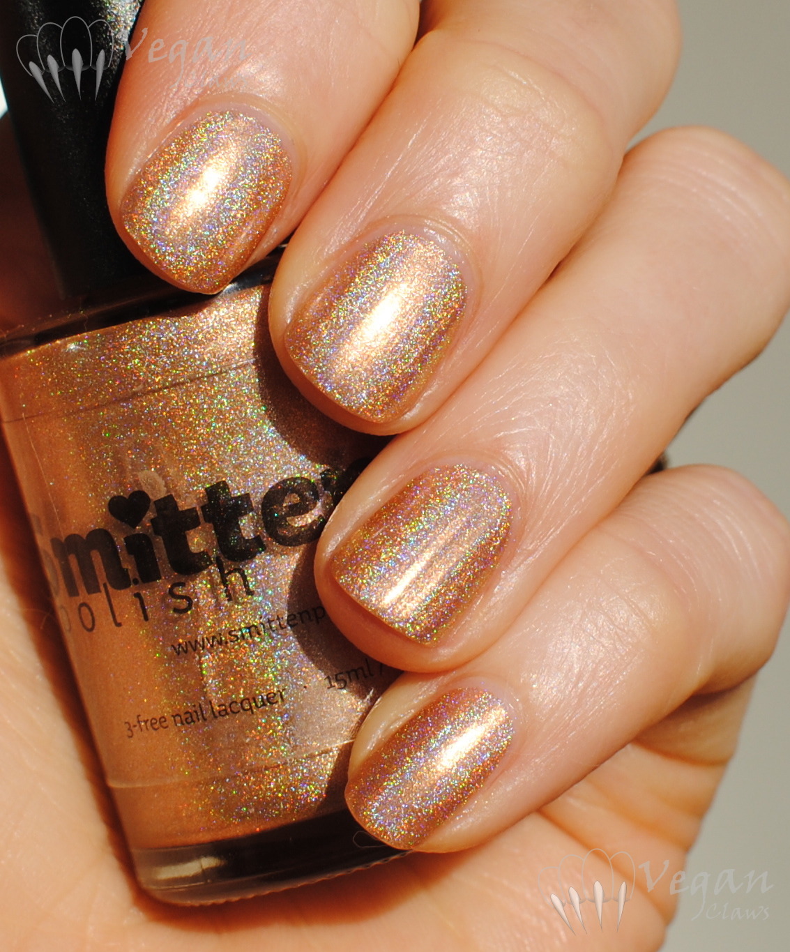 This gorgeous apricot-toned gold holo is A Parliament of Owls by Smitten Polish. Three coats with an easy to work with and fast-drying holo formula. In the sun: