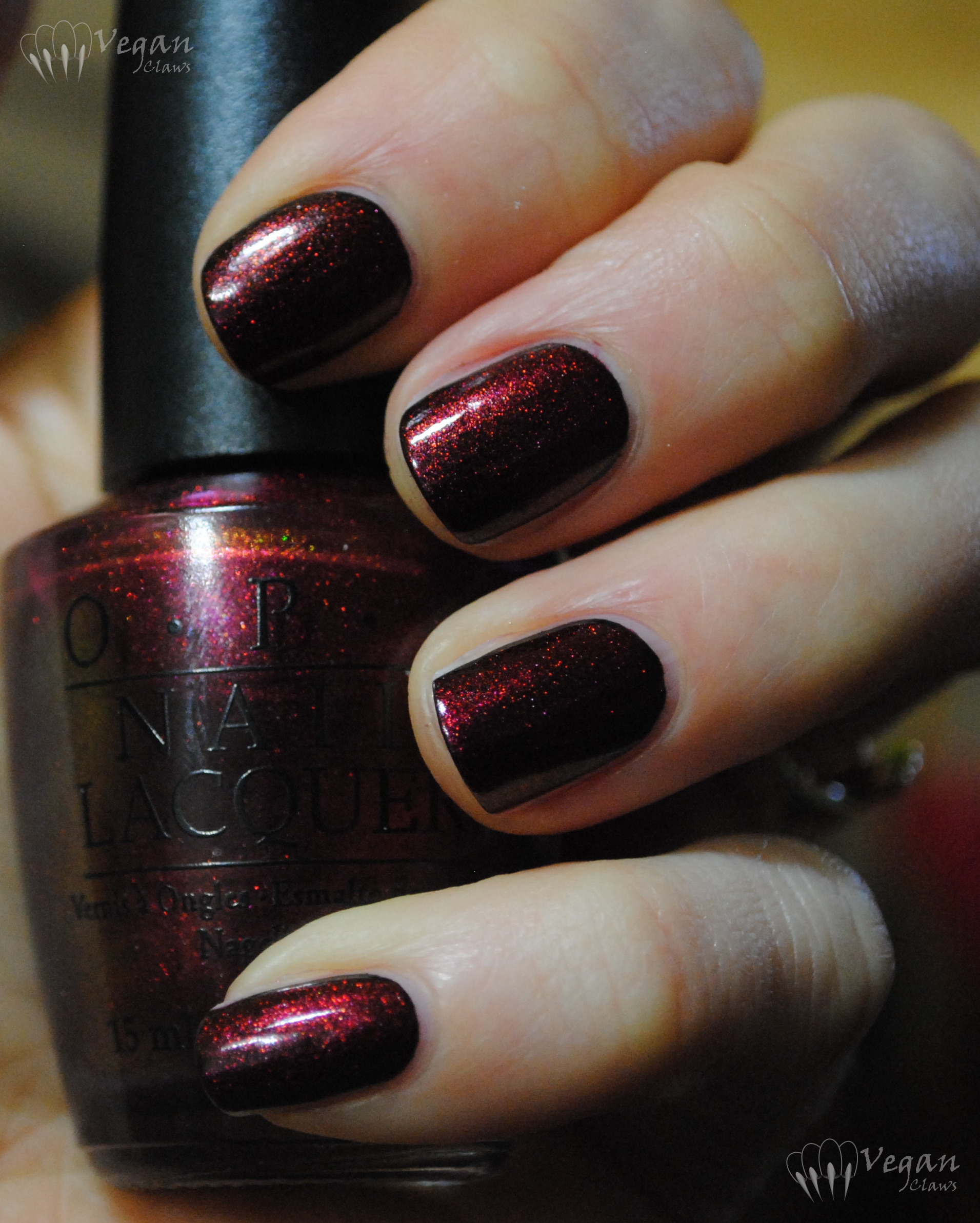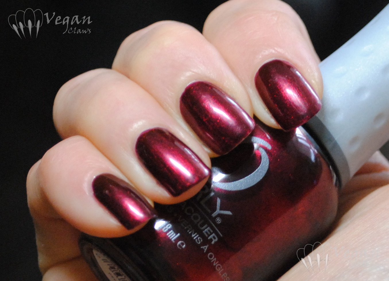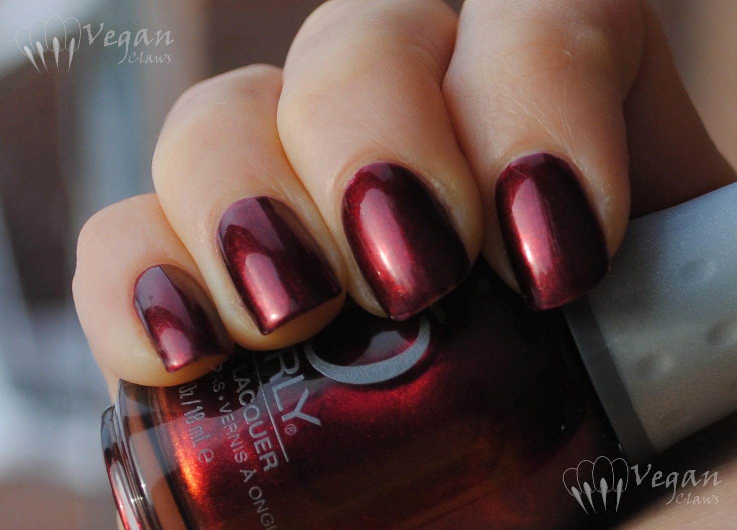 Orly Smolder is from last fall’s Fired Up collection (these photos were actually also taken last fall, still have a backlog of posts!). It’s a beautiful, dark glowing burgundy wine red shimmer. It’s not so dark that it ever looks black, and there is a hint of an orange flash to it in the bottle, that doesn’t really show up on the nail. Gorgeous colour, though!