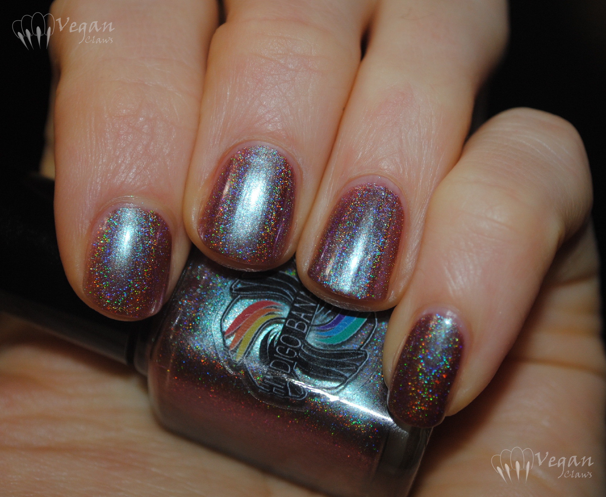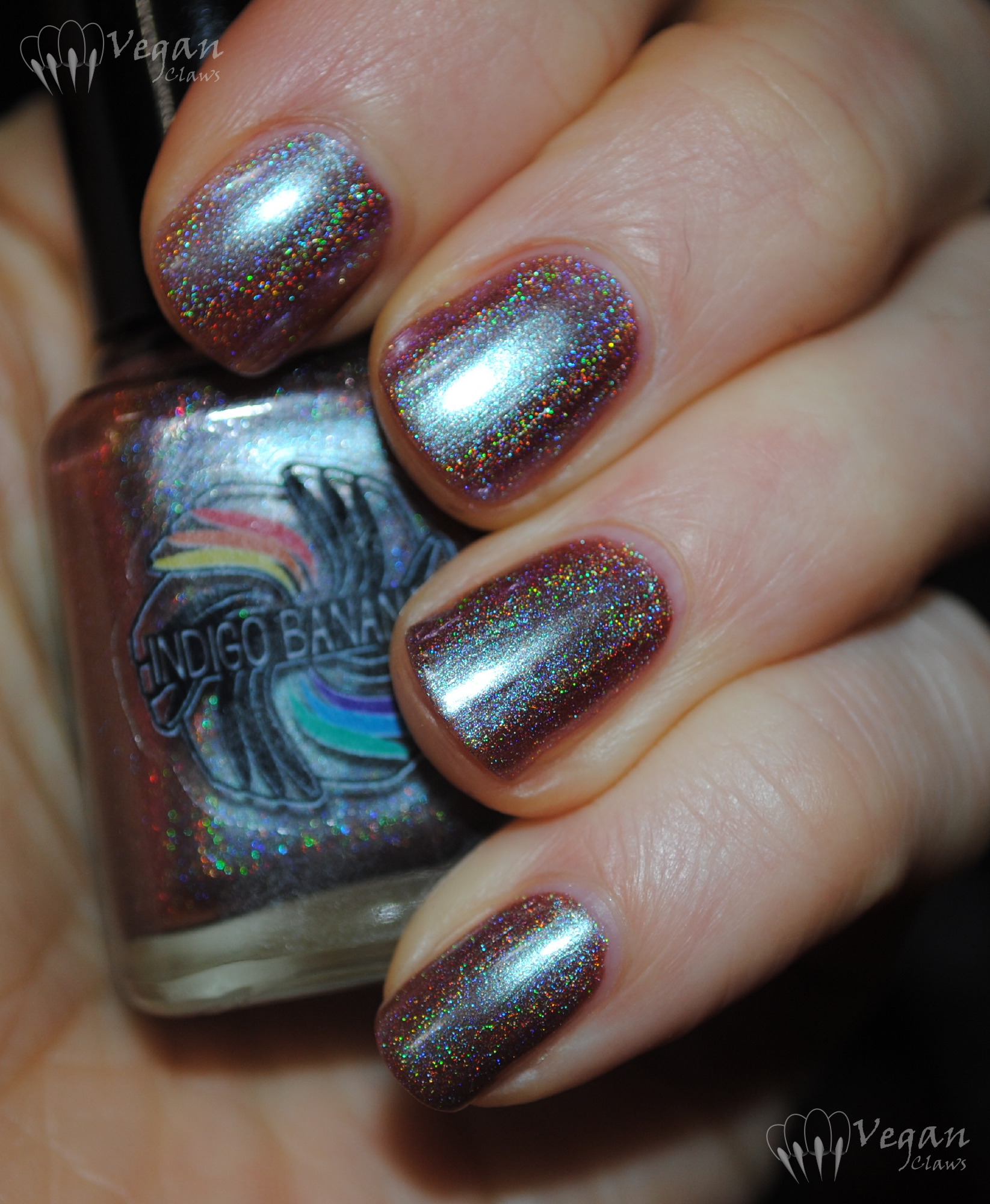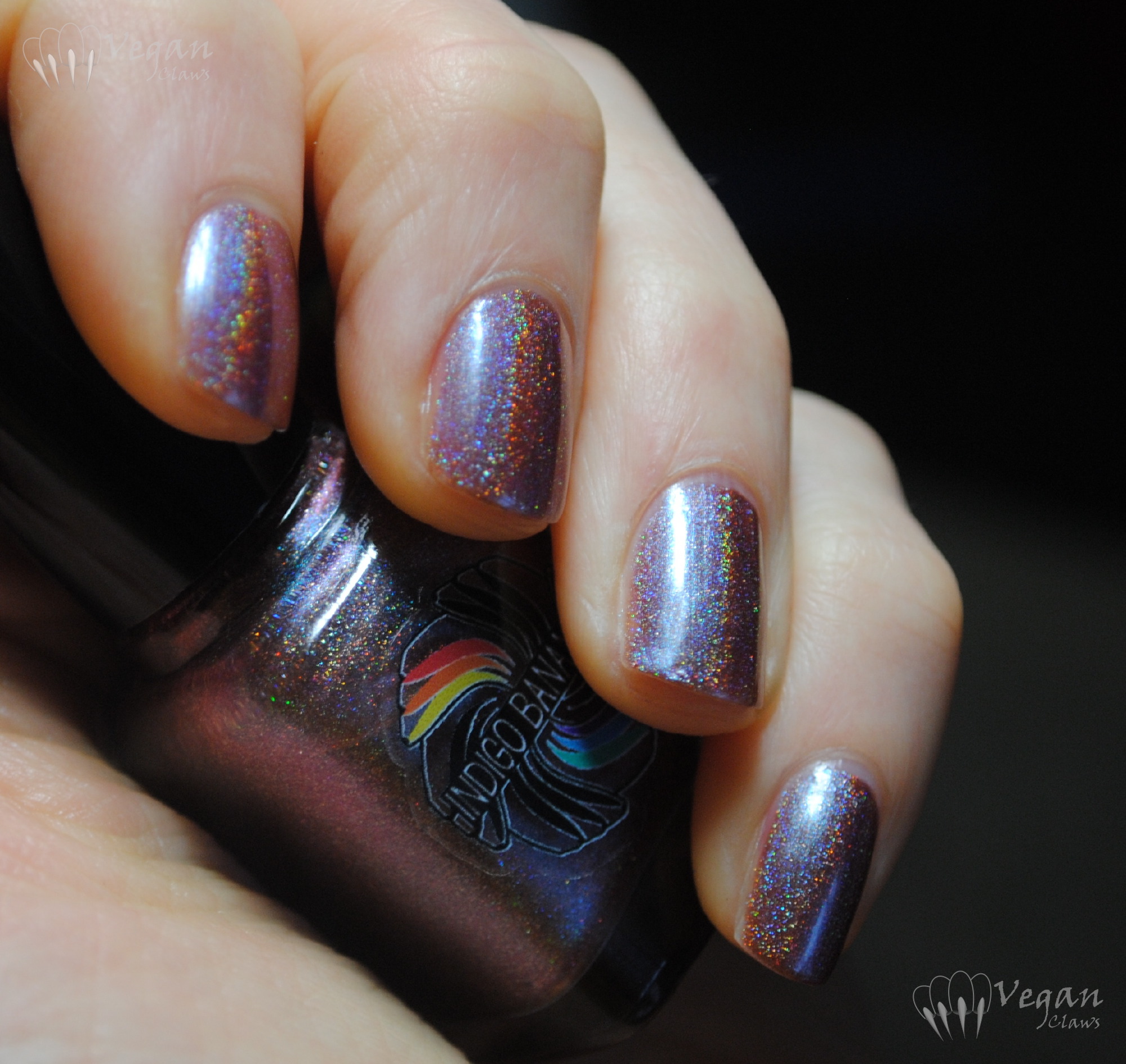 This is Indigo Bananas Endless Nights, a plum/burgundy duochrome holo with strong blue/pink duochrome. I can’t remember if this was two or three coats.