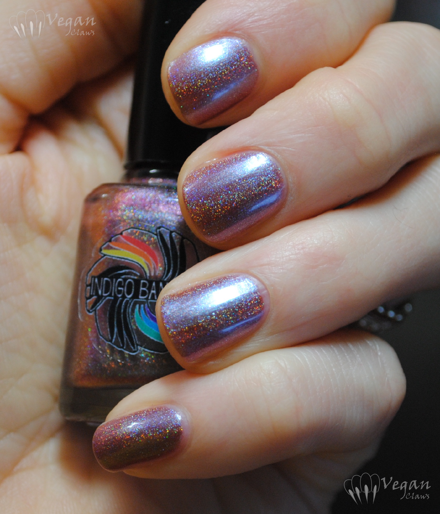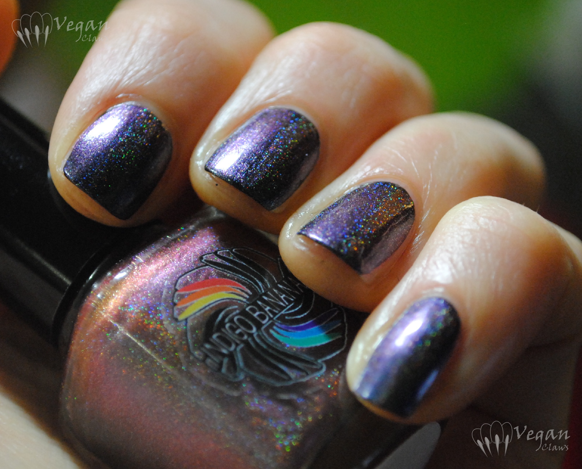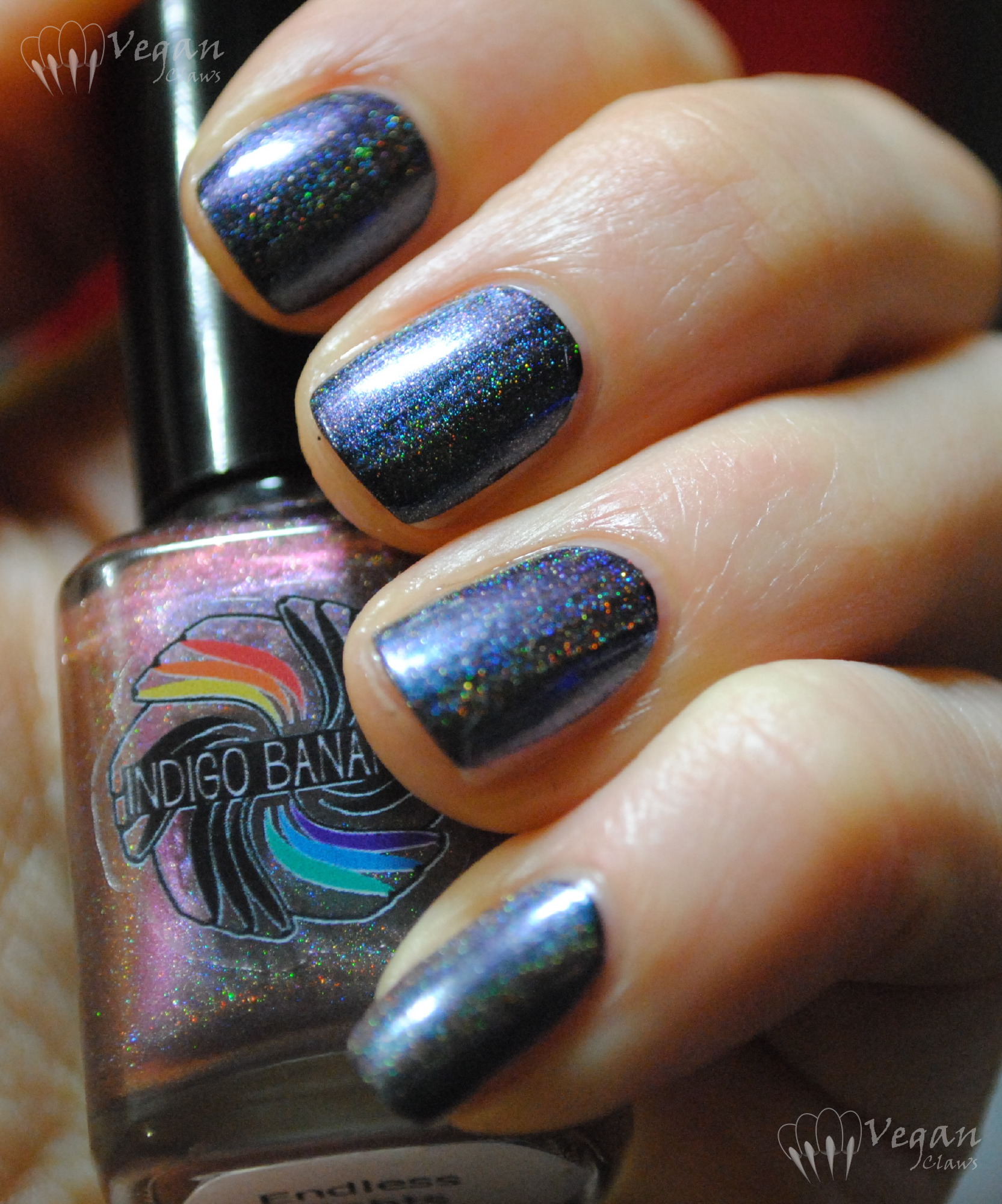 This is Indigo Bananas Endless Nights, a plum/burgundy duochrome holo with strong blue/pink duochrome. I can’t remember if this was two or three coats.