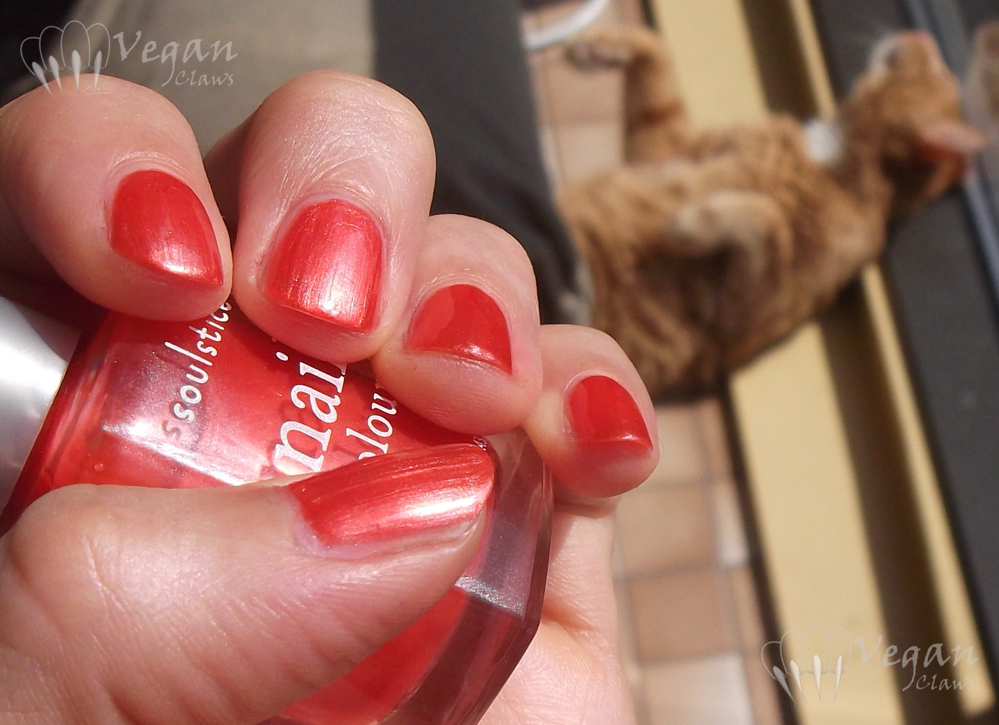 Rio. A very bright frosty coral red. This one is more sheer than the others. This is three coats, the last coat being fairly thick. My nails aren’t in the greatest shape these days so I wanted to hide the unevenness and places where there were some peeling spots that had absorbed the darker burgundy polishes. This had a similar formula to the other non-cremes and didn’t really give me any trouble with brush strokes. Hanging out in the background of these shots is our kitty Wu being cute; I didn’t have the heart to crop him out!!