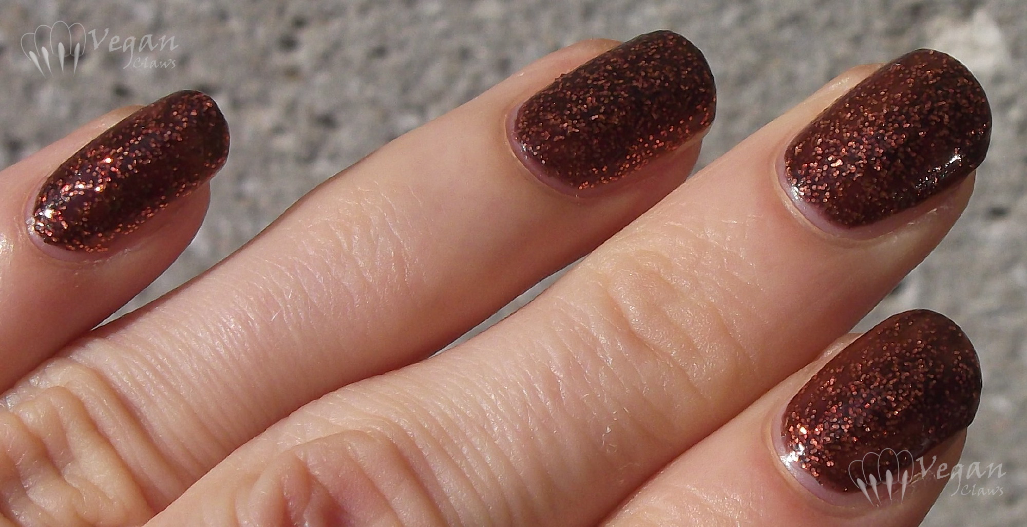 These photos are of one generous coat of Buckled Bronze over one coat of Kleancolor Black; these are sheer duochromes that show their full effect over black (or another very dark colour).