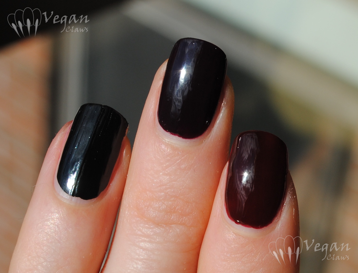 Lastly, here is a comparison between Berlin, Kleancolor Black (one coat), and Kiev to show the relative depth of the colours.