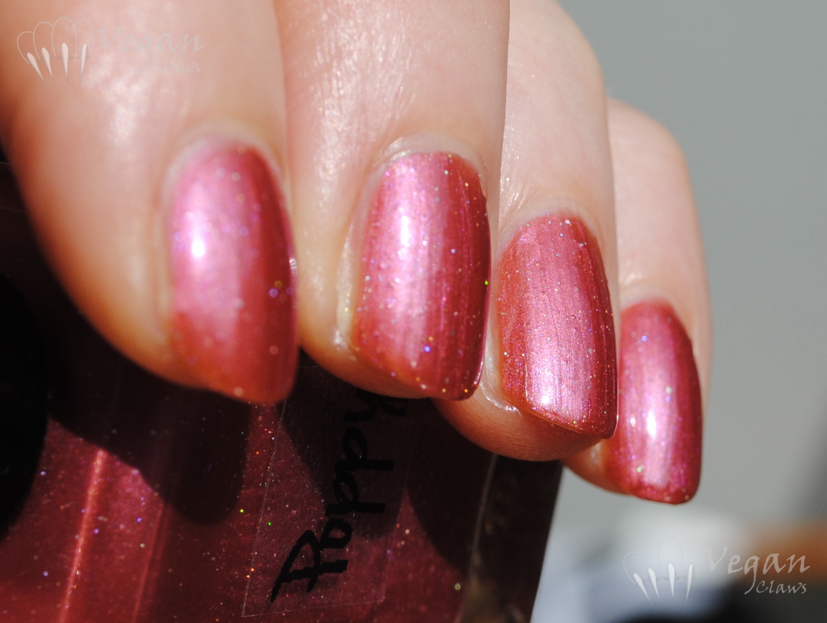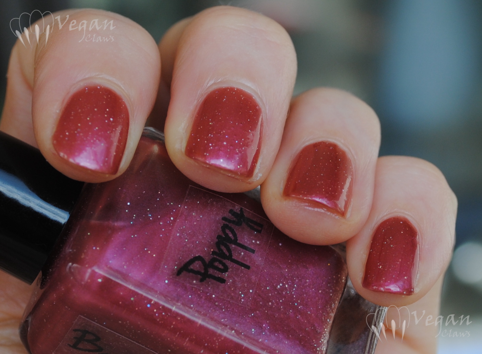 This is two coats of Poppy the polish (three on my pinky, just because of a smudge). The application of this polish was smooth and easy.