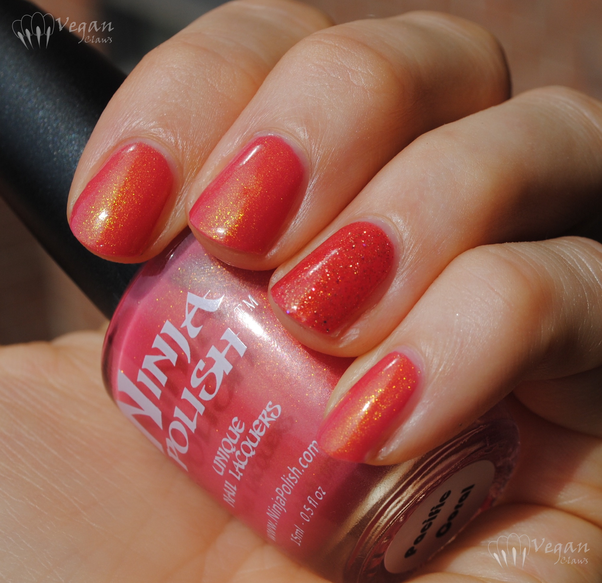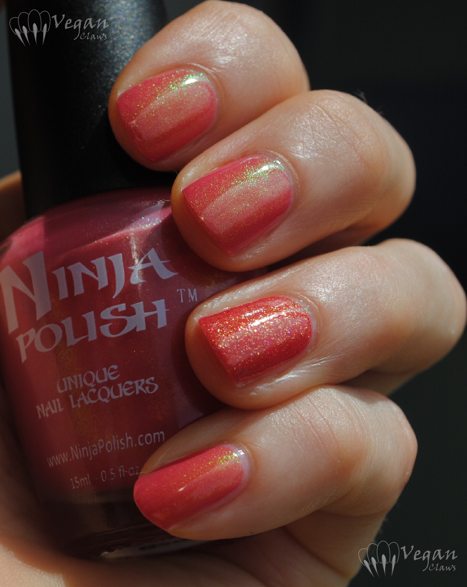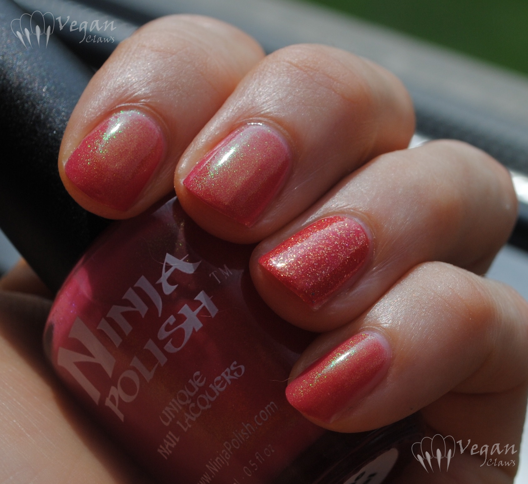 Mr. Kitty the polish is a sheer taupe based polish with pink duochrome shimmer and tiny flakes in it. It’s kind of a chameleon and looks different in different lighting! The pink/magenta shimmer sometimes leans lavender or purple, and other times shifts more to a golden/coppery, rusty brick tone.