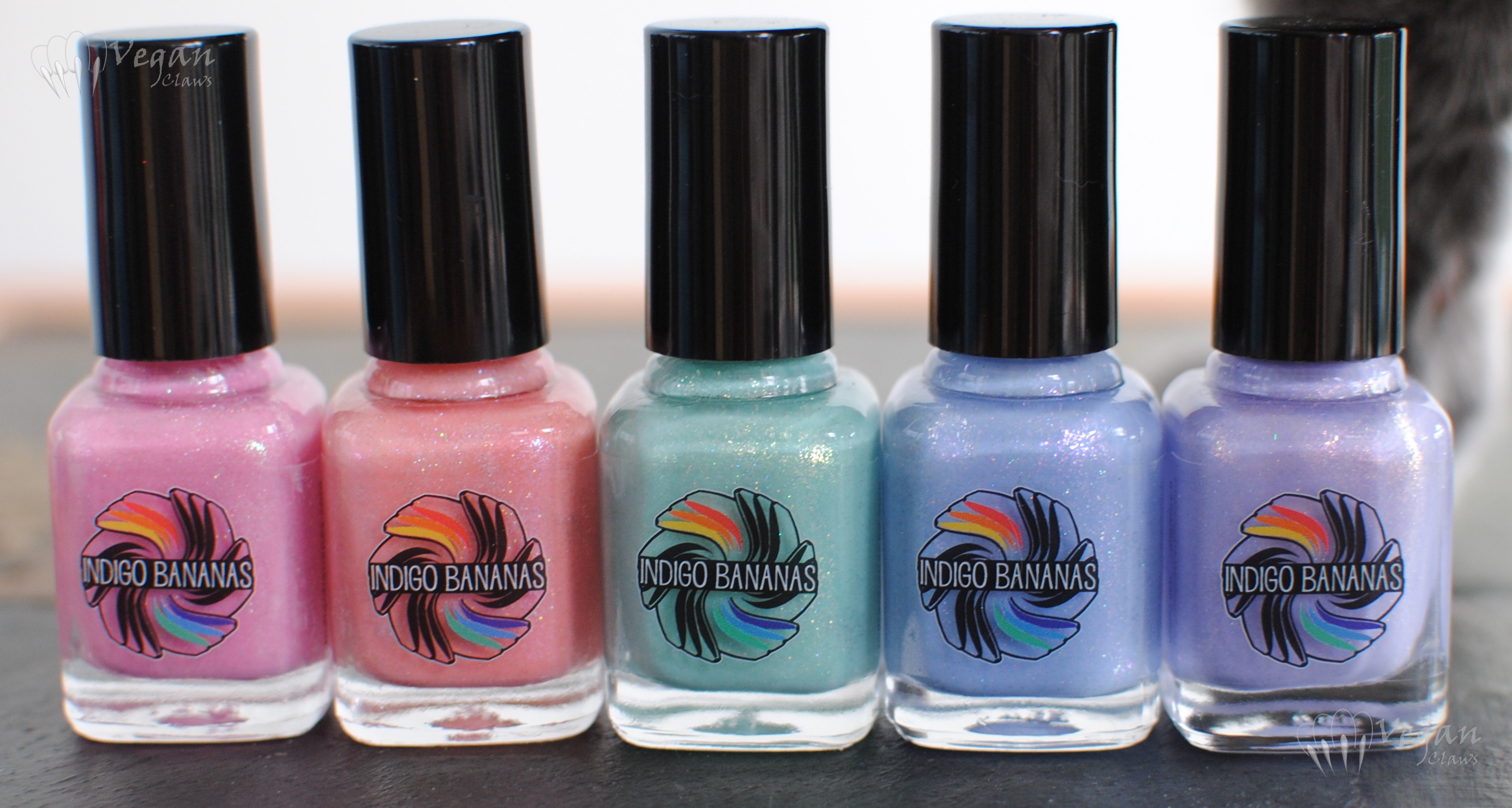 Better late than never? I’ve got skittle swatches of the Indigo Bananas Spring 2015 collection today. I used three coats for each plus top coat, and the swatch photos are all with flash.