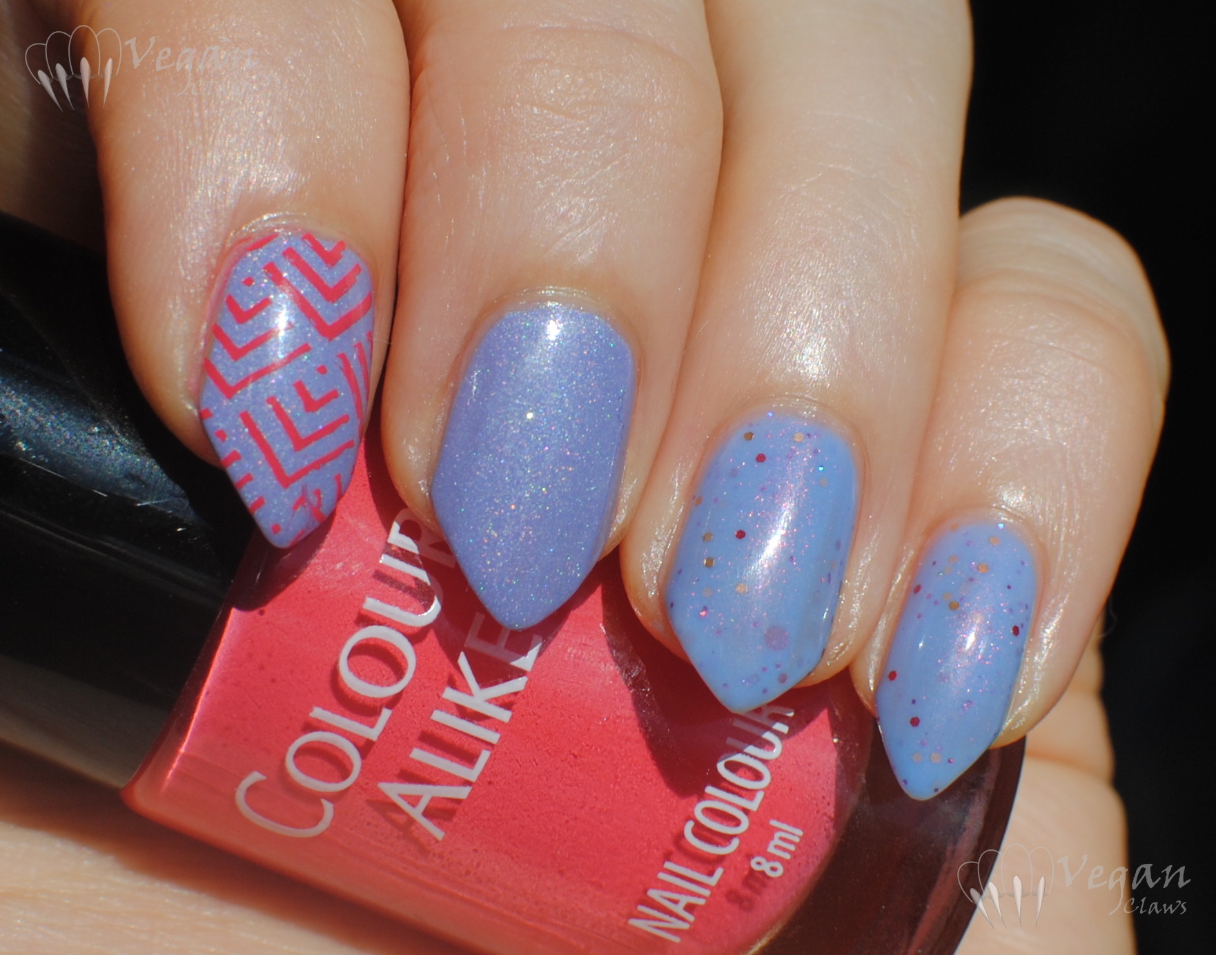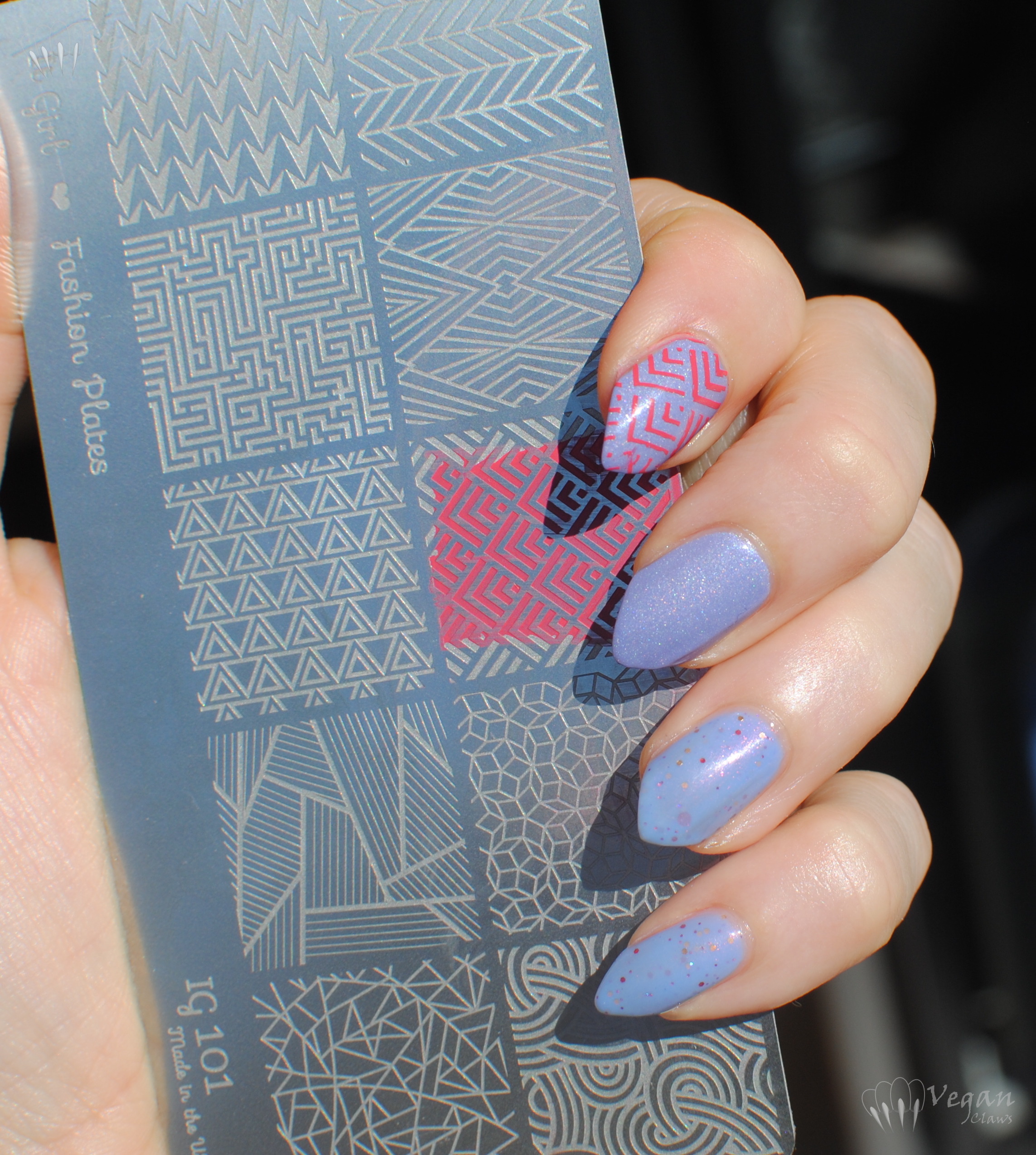 I added some stamping to the accent nail that didn’t really turn out, since it’s not very visible, but here it is anyway. I used my bottle of Kleancolor Metallic Sapphire, which is strangely no longer its original royal blue colour, but is now a dusty dark purple. I’ve seen fading blue pigments before, but this was kind of strange in that it turned really quite purple! It almost looks like OPI Ink Suede now, except more muted and even more purple. Anyway, it wasn’t enough of a contrast to Pipe Bender to show up well, unfortunately, and I liked the mani better without the stamping. The image is from plate Hehe-024.