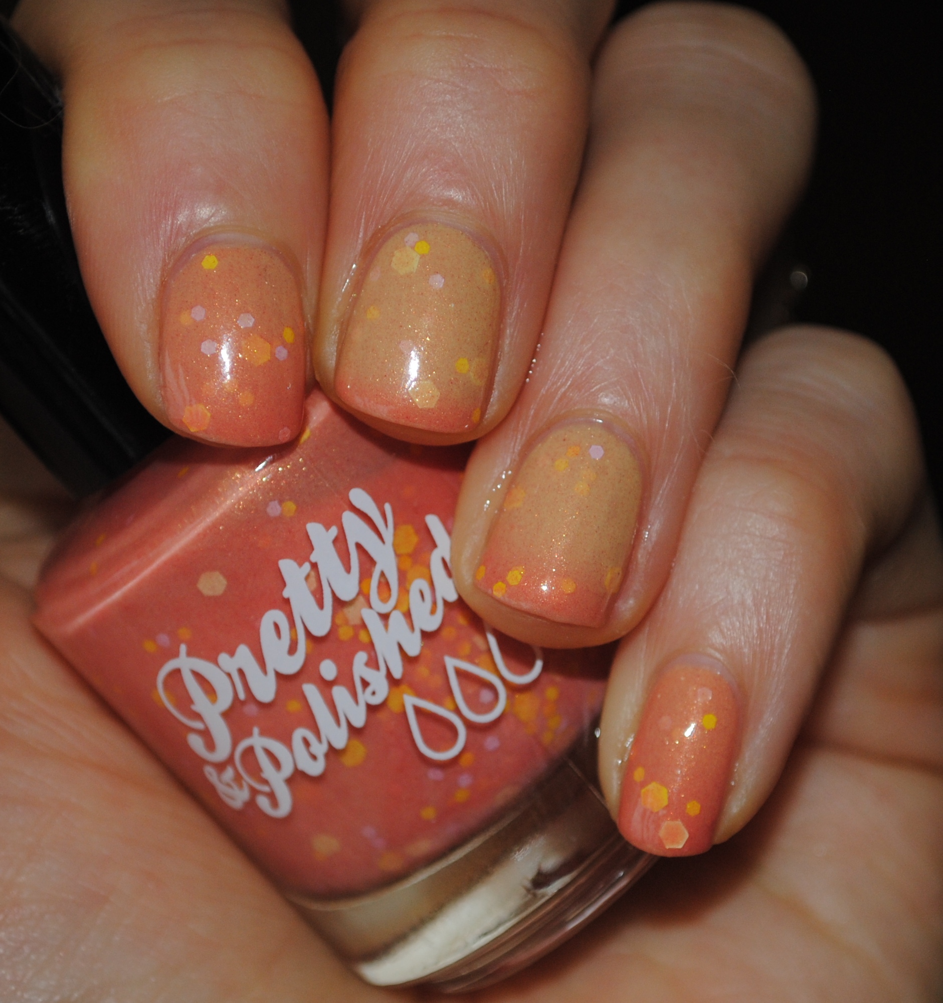 In its cool/room temperature state, Sundown is a light apricot orange colour, with matte hex glitters in orangey yellow, pink and pale yellow.